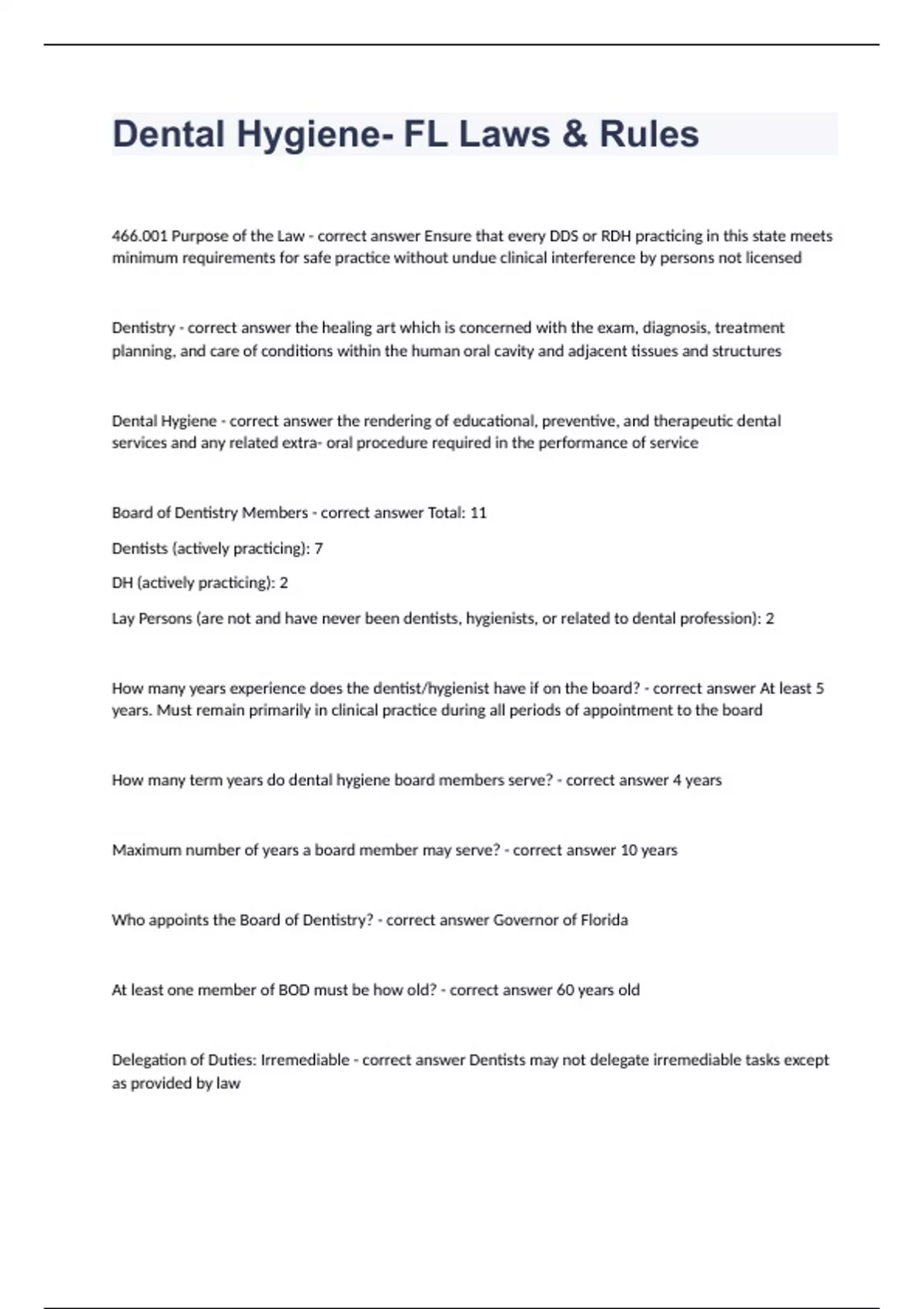466.001 Purpose of the Law - correct answer Ensure that every DDS or RDH practicing in this state meets minimum requirements for safe practice without undue clinical interference by persons not licensed Dentistry - correct answer the healing art which is concerned with the exam, diagnosis, treatment planning, and care of conditions within the human oral cavity and adjacent tissues and structures Dental Hygiene - correct answer the rendering of educational, preventive, and therapeutic dental services and any related extra- oral procedure required in the performance of service Board of Dentistry Members - correct answer Total: 11 Dentists (actively practicing): 7 DH (actively practicing): 2 Lay Persons (are not and have never been dentists, hygienists, or related to dental profession): 2 How many years experience does the dentist/hygienist have if on the board? - correct answer At least 5 years. Must remain primarily in clinical practice during all periods of appointment to the board How many term years do dental hygiene board members serve? - correct answer 4 years Maximum number of years a board member may serve? - correct answer 10 years Who appoints the Board of Dentistry? - correct answer Governor of Florida At least one member of BOD must be how old? - correct answer 60 years old Delegation of Duties: Irremediable - correct answer Dentists may not delegate irremediable tasks except as provided by law