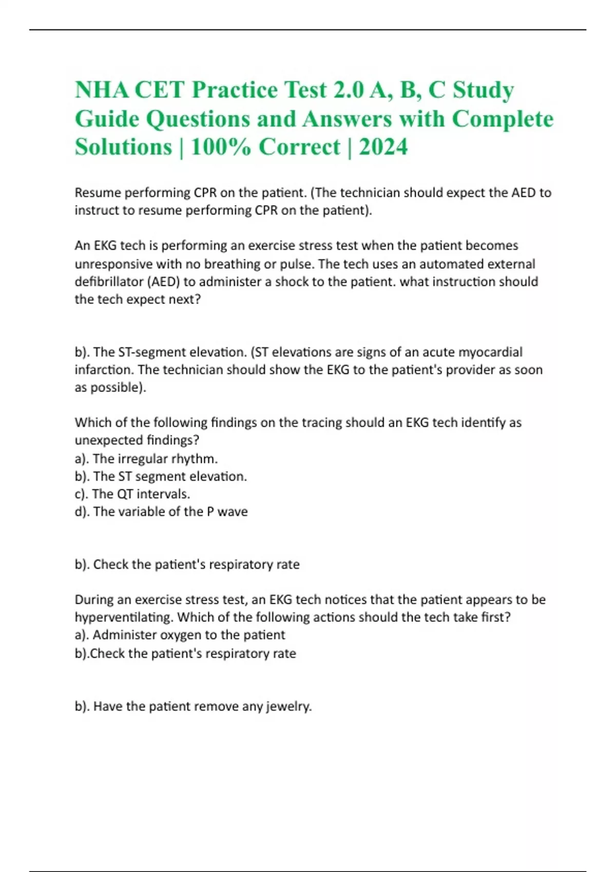 NHA CET Practice Test 2.0 A, B, C Study Guide Questions and Answers with Complete Solutions | 100% Correct | 2024