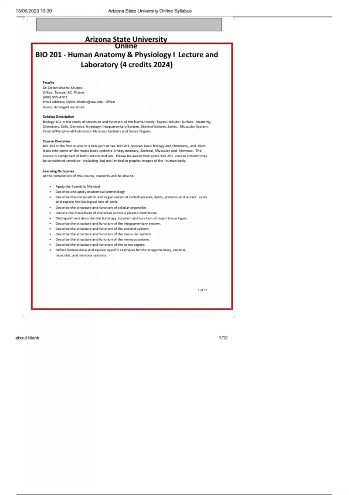 Arizona State University Online BIO 201 - Human Anatomy & Physiology I Lecture and Laboratory (4 credits 2024) Faculty Dr. Delon Washo-Krupps Office: Tempe, AZ Phone: (480) 965-4501 Email address: Office hours: Arranged via email Catalog Description Biology 201 is the study of structure and function of the human body. Topics include: Surface Anatomy, Chemistry, Cells, Genetics, Histology, Integumentary System, Skeletal System, Joints, Muscular System, Central/Peripheral/Autonomic Nervous Systems and Sense Organs. Course Overview BIO 201 is the first course in a two-part series. BIO 201 reviews basic biology and chemistry, and then leads into some of the major body systems: Integumentary, Skeletal, Muscular and Nervous. The course is comprised of both lecture and lab. Please be aware that some BIO 201 course content may be considered sensitive - including, but not limited to graphic images of the human body. Learning Outcomes At the completion of this course, students will be able to: •Apply the Scientific Method •Describe and apply anatomical terminology •Describe the composition and organization of carbohydrates, lipids, proteins and nucleic acids and explain the biological role of each. •Describe the structure and function of cellular organelles •Outline the movement of materials across a plasma membrane. •Distinguish and describe the histology, location and function of major tissue types. •Describe the structure and function of the integumentary system. •Describe the structure and function of the skeletal system. •Describe the structure and function of the muscular system. •Describe the structure and function of the nervous system. •Describe the structure and function of the sense organs. •Define homeostasis and explain specific examples for the integumentary, skeletal, muscular, and nervous systems. 1 of 11 Course Materials 1.Textbook: Anatomy & Physiology: The Unity of Form and Function by Kenneth Saladin, 7th edition, McGraw-Hill A hardcopy of the textbook can be purchased from a variety of online vendors, or you may just use the e-book, which is already bundled with the web materials (see below). You may also use a 5th or 6th edition hardcopy of the text to save some $. If you use an older edition of the text, you will still need 7th edition Connect Access (see below). 2.Connect Website: McGraw-Hill Connect for Saladin 7e The majority of your course assignments will be completed through Connect. To purchase access, or register, just click the "Connect Assignments" tab to the left, or access Connect under any weekly heading. Purchasing Connect gives you access to the materials for two semesters. That means you pay once for both BIO 201 and 202! 3.Anatomy & Physiology Revealed (APR) - this is interactive, virtual cadaver dissection software through McGraw-Hill, and it is amazing! Access to APR is included with your purchase of Connect, and will be accessed through the Connect website. There is no additional charge for APR. 4.LearnSmart Labs - these are virtual anatomy and physiology labs. Access to Learnsmart Labs is included with your purchase of Connect, and will be accessed through the Connect website. There is no additional charge for Learnsmart Labs. 5.Lab Dissection Kit - this kit will include biological specimens for hands-on dissection. Purchase the BIO 201 kit at www.S. If you will also be taking BIO 202, you can save some money by purchasing the BIO 201/202 combo kit, rather than purchasing the two kits separately. Course Topics, Schedule, & Grading Activities used for instruction and assessment of learning include: discussion/presentations; textbook and supplemental readings; individual and group activities/assignments; hands-on dissections and case scenarios. Grading Grade Percentage Points Range A 90 – 100% 900-1000 points B 80 – 89% 800-899 points C 70 – 79% 700-799 points D 60 – 69% 600-699 points E/F Below 60% 599 and below 2 of 11 Grading Procedure Grades reflect your performance on assignments and adherence to deadlines. Most graded assignments will be available within 72 hours of the due date via the Gradebook or in Connect. Lab quizzes and lab practical exams contain numerous fill-in-the-blank questions which must be hand-graded. Lab Report grades will be available within two weeks of the due date. All weekly assignments are due at 11:59 PM Arizona time on Sunday of each week. There is a 24 hour grace period for completion of assignments, therefore the final weekly deadline is 11:59 PM Arizona time on Monday each week. This grace period is to be used in cases of emergency. If an unavoidable issue occurs over the weekend, you may use Monday to complete assignments. If you choose to put off assignments until Monday and then experience any personal or technical issues, please be aware that you may not have enough time to fix the situation and deadlines for due dates will NOT be extended for any reason. DO NOT schedule exams during the Monday grace period. If technical issues arise with an exam, accommodations can be made to take the exam during the grace period, but you should never initially schedule an exam during that period of time. Proctored Exams Due to the nature and importance of the subject matter, all lecture and lab exams for BIO 201 will be Proctored through ProctorU. No notes will be permitted. There are four lecture exams and two lab practical exams. There may be an additional fee for this service - ASU Online has picked up the costs for the proctored exams in the past, but this is not a guaranteed every semester. On average, you can expect to pay around $120 in total. Please go to www.ProctorU.com for more information. For all exams you will need to be in a secure environment and your computer will have to be equipped with a functioning camera and microphone. You are not permitted to take exams in a public place, in the presence of other people, in a vehicle, etc. Communicating With the Instructor This course uses a dis