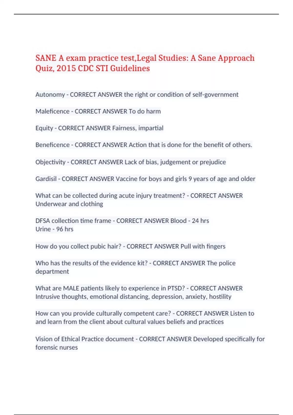 SANE A exam practice test,Legal Studies: A Sane Approach Quiz, 2015 CDC STI Guidelines,100% CORRECT