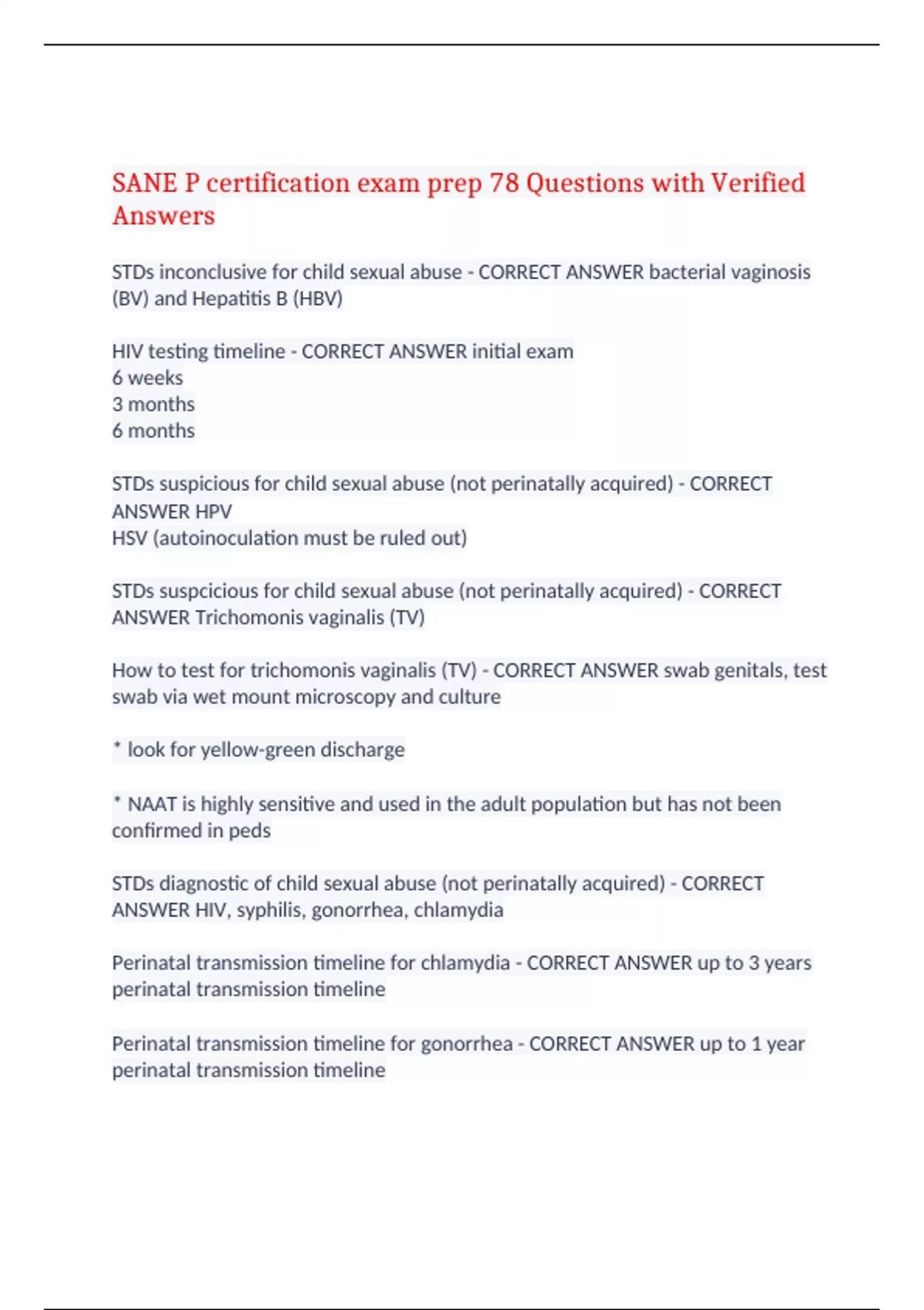 SANE P certification exam prep 78 Questions with Verified Answers STDs inconclusive for child sexual abuse - CORRECT ANSWER bacterial vaginosis (BV) and Hepatitis B (HBV) HIV testing timeline - CORRECT ANSWER initial exam 6 weeks 3 months 6 months STDs suspicious for child sexual abuse (not perinatally acquired) - CORRECT ANSWER HPV HSV (autoinoculation must be ruled out) STDs suspcicious for child sexual abuse (not perinatally acquired) - CORRECT ANSWER Trichomonis vaginalis (TV) How to test for trichomonis vaginalis (TV) - CORRECT ANSWER swab genitals, test swab via wet mount microscopy and culture * look for yellow-green discharge * NAAT is highly sensitive and used in the adult population but has not been confirmed in peds STDs diagnostic of child sexual abuse (not perinatally acquired) - CORRECT ANSWER HIV, syphilis, gonorrhea, chlamydia Perinatal transmission timeline for chlamydia - CORRECT ANSWER up to 3 years perinatal transmission timeline Perinatal transmission timeline for gonorrhea - CORRECT ANSWER up to 1 year perinatal transmission timeline Perinatal transmission timeline for syphilis - CORRECT ANSWER up to 6 months perinatal transmission timeline perinatal transmission timeline for trichomonas - CORRECT ANSWER 6 months up to 3 years perinatal transmission timeline perinatal transmission timeline for herpes simplex virus (HSV) - CORRECT ANSWER up to 4 weeks perinatal transmission timeline perinatal transmission timeline for human papilloma virus (HPV) - CORRECT ANSWER up to 3 years perinatal transmission timeline How to test for chlamydia - CORRECT ANSWER NAAT test- girls urine -vaginal swab Culture- boys urine - boys urethral discharge - vagina - anus no test for pharyngeal site Signs and symptoms, or evidence of STD infection in children- what is the next step? - CORRECT ANSWER Test, don't treat until tests have been confirmed How to test for gonorrhea - CORRECT ANSWER NAAT test- girls urine Culture- boys urine - pharynx - anus - urethral discharge (boys) - vagina How to test for bacterial vaginosis - CORRECT ANSWER *swab genitals and test with wet mount microscopy *look for "clue cells" ( vaginal epithelial cells studded with coccoobacilli) under the microscope *10 % KOH whiff test * visually examine for thin white discharge that smoothly coats the vaginal walls How to test for HSV - CORRECT ANSWER culture of lesions How to test for HPV - CORRECT ANSWER visual exam How to test for syphilis - CORRECT ANSWER serology testing for t. pallidium Follow up testing timeline for syphilis - CORRECT ANSWER serology testing 6 weeks post assault Follow up testing timeline for Hep B - CORRECT ANSWER serology testing 6 weeks and 3 months post assault Do we test all children for STDs who present for a sexual assault exam? - CORRECT ANSWER no, case- by case basis s/p sexual assault: if the assailant's Hep B status is unknown and the child is unvaccinated, what do we give - CORRECT ANSWER Hep B Vaccine s/p sexual assault: if the assailant is known to be Hep B positive (HBS-Ag +) and the child is unvaccinated, what do we give? - CORRECT ANSWER Hep B vaccine and Hep B immunoglobulins (HBIG) What is the usual Hepatitis B vaccination schedule? - CORRECT ANSWER birth, 2 months, and 6 months s/p sexual assault: if the assailant is known to be Hep B positive (HBs-Ag +) and the child is vaccinated, what do we give? - CORRECT ANSWER Hep B vaccine booster dose x1 HIV prophylaxis - CORRECT ANSWER nPEP x 28 days must be started within 72 hours nPEP for children < 45kg - CORRECT ANSWER 3 drug regime: zidovudine lamivudine raltegravir nPEP for children >45kg - CORRECT ANSWER treat as an adult 3 drug regime: emtricitabine tenofovir raltegravir treatment for syphilis for children < 45 kg - CORRECT ANSWER IM Benzathine penicillin G 50 units/kg x1 dose (max 2.4 million units) treatment for syphilis for children > 45 kg - CORRECT ANSWER adult dosing IM benzathine penicillin G 2.4 million units x 1 dose treatment for chlamydia for children <45kg - CORRECT ANSWER PO erythromycin 50mg/kg/day x 14 days QID divided doses treatment for chlamydia for children > 45 kg - CORRECT ANSWER adult dosing PO Azithromycin 1 g x1 dose side effects: nausea, vomiting treatment for gonorrhea for children <45kg - CORRECT ANSWER IM ceftriaxone x1 dose 50mg/kg (max 125mg) treatment for gonorrhea for children >45kg - CORRECT ANSWER IM ceftriaxone 250mg x 1 dose alternate medication to treat gonorrhea if IM ceftriaxone can't be taken - CORRECT ANSWER PO cefixime 400mg x1 alternate medication to treat chlamydia if PO azithromycin can be taken - CORRECT ANSWER Doxycycline 100 mg BID x 7 days child must be at least 8yo treatment for trichomonas - CORRECT ANSWER PO metronidazole 2 g x 1 dose metronidazole education instructions - CORRECT ANSWER side effects: nausea, may cause a weird taste in your mouth must wait at least 24-72 hours since the last ingestion of alcohol to avoid a disulfiram like reaction (severe vomiting) hymenal findings commonly seen in nonabused children - CORRECT ANSWER *hymen with tags, mounds *hymen with a notch or cleft regardless of depth on the anterior rim (above 9 o'clock and 3 o'clock) * hymen with a superficial notch or cleft on the posterior rim (below 9 o'clock and 3 o'clock) *smooth posterior rim that appears to be relatively narrow along the entire rim Linea vestibularis (midline avascular area) is a normal variant? (yes or no) - CORRECT ANSWER yes, commonly seen in nonabused children genital erythema is commonly caused by medical conditions other than trauma or sexual contact (yes or no) - CORRECT ANSWER yes, commonly seen in nonabused children venous pooling, partial dilation of external anal sphincter which internal sphincter closed, and visualization of anal pectinate line, and rectal prolapse- are these consistent with abuse? - CORRECT ANSWER no, these are conditions mistaken for abuse and are commonly seen in nonabused children complete anal dilatation of both internal and external sphincters in 