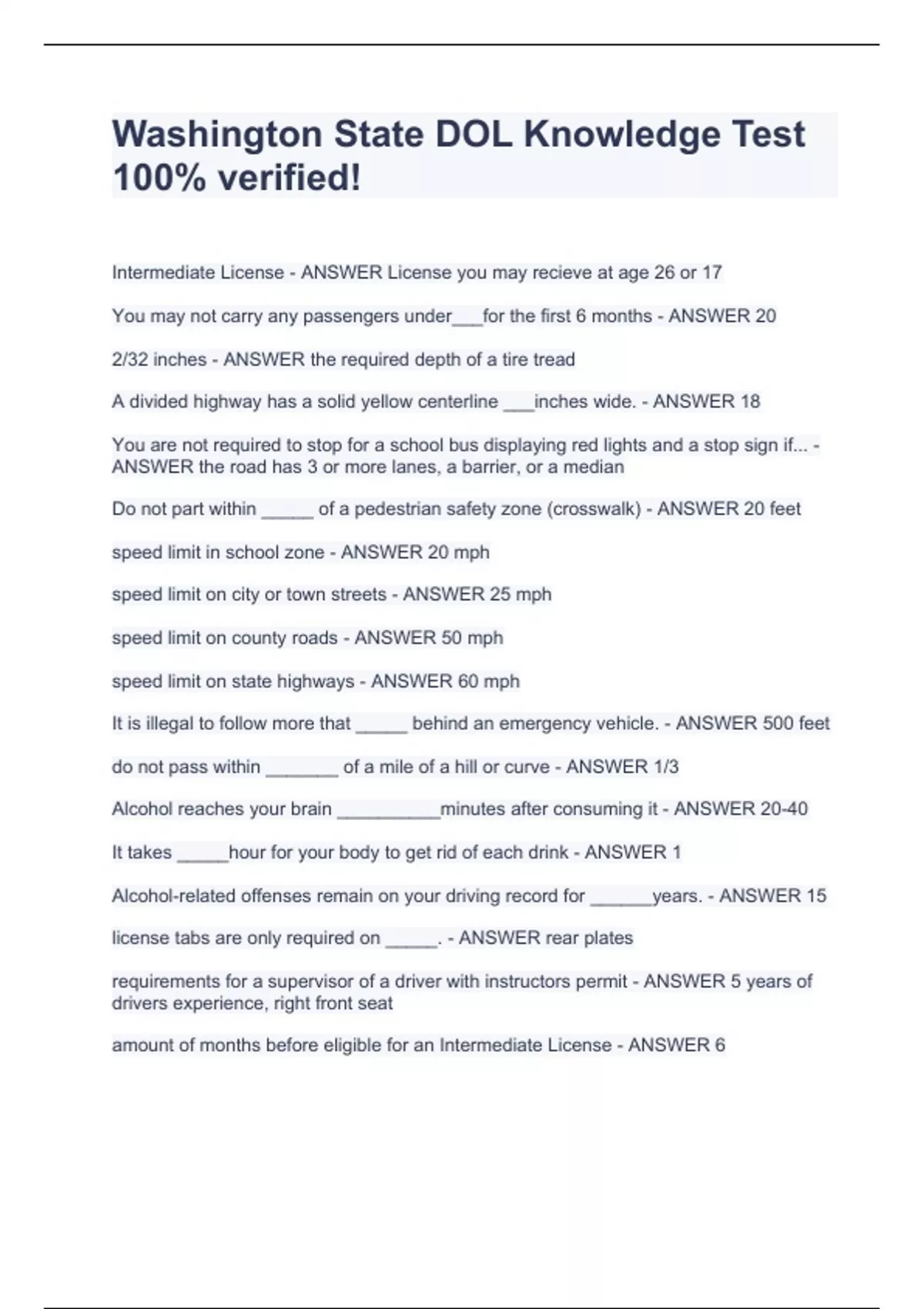 Washington State DOL Knowledge Test 100% verified! Intermediate License - ANSWER License you may recieve at age 26 or 17 You may not carry any passengers under___for the first 6 months - ANSWER 20 2/32 inches - ANSWER the required depth of a tire tread A divided highway has a solid yellow centerline ___inches wide. - ANSWER 18 You are not required to stop for a school bus displaying red lights and a stop sign if... - ANSWER the road has 3 or more lanes, a barrier, or a median Do not part within _____ of a pedestrian safety zone (crosswalk) - ANSWER 20 feet speed limit in school zone - ANSWER 20 mph speed limit on city or town streets - ANSWER 25 mph speed limit on county roads - ANSWER 50 mph speed limit on state highways - ANSWER 60 mph It is illegal to follow more that _____ behind an emergency vehicle. - ANSWER 500 feet do not pass within _______ of a mile of a hill or curve - ANSWER 1/3
