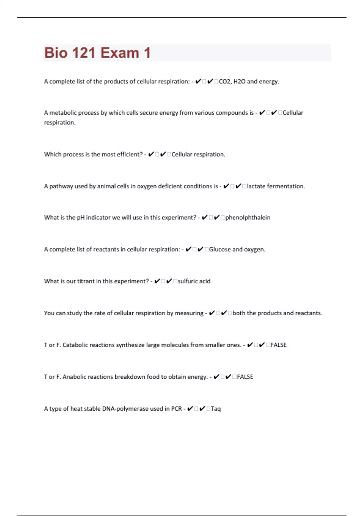 A complete list of the products of cellular respiration: - ️️CO2, H2O and energy. A metabolic process by which cells secure energy from various compounds is - ️️Cellular respiration. Which process is the most efficient? - ️️Cellular respiration. A pathway used by animal cells in oxygen deficient conditions is - ️️lactate fermentation. What is the pH indicator we will use in this experiment? - ️️phenolphthalein A complete list of reactants in cellular respiration: - ️️Glucose and oxygen. What is our titrant in this experiment? - ️️sulfuric acid You can study the rate of cellular respiration by measuring - ️️both the products and reactants. T or F. Catabolic reactions synthesize large molecules from smaller ones. - ️️FALSE T or F. Anabolic reactions breakdown food to obtain energy. - ️️FALSE A type of heat stable DNA-polymerase used in PCR - ️️Taq