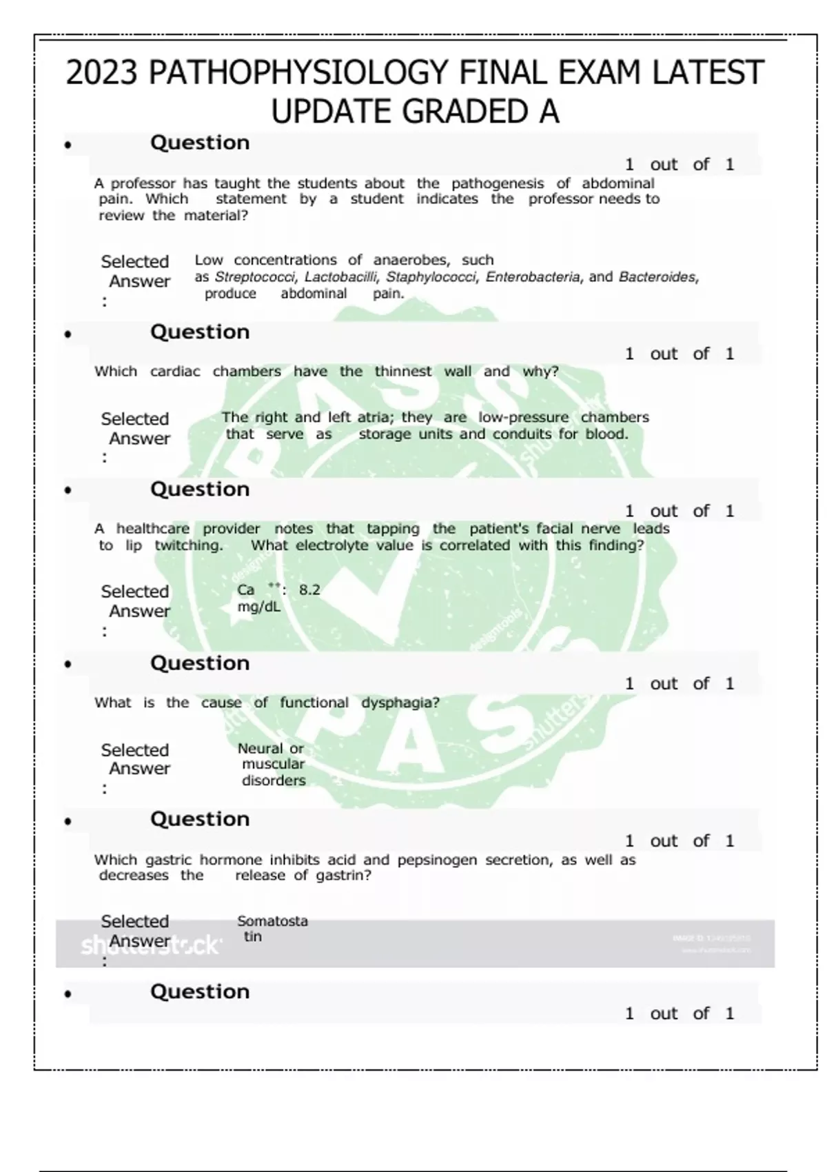 2023 PATHOPHYSIOLOGY FINAL EXAM LATEST UPDATE GRADED A Question 1 fout fof f1 Question 1 fout fof f1 Question 1 fout fof f1 Question 1 fout fof f1 Question 1 fout fof f1 Why is leakage of lysosomal enzymes during chemical injuries significant? Selected Answer Enzymatic digestion of the nucleus and nucleolus occurs, halting DNA synthesis. : The student wants information about a patient's renal function. What test does the healthcare professional tell the student to evaluate? Selected Answer Glomerular filtration rate : A student is preparing to irrigate a patient's wound and gathers supplies, including hydrogen peroxide. What response by the health care professional is best? Selected Answer Tell the student to get some normal saline instead. : A patient suffered multiple traumatic injuries and received many blood transfusions within a few days of the injuries. For which medical condition should the healthcare professional monitor the patient for? Selected Answer Hemosidero sis : The data reporting that sickle cell disease affects approximately 1 in 600 American blacks is an example of which concept? Selected Answer Prevalen ce : Question 1 fout fof f1 2023 PATHOPHYSIOLOGY FINAL EXAM LATEST UPDATE GRADED A A patient has a history of excessive use of magnesium-containing antacids and aluminum-containing antacids. What lab value does 2023 PATHOPHYSIOLOGY FINAL EXAM LATEST UPDATE GRADED A the healthcare professional correlate to this behavior?