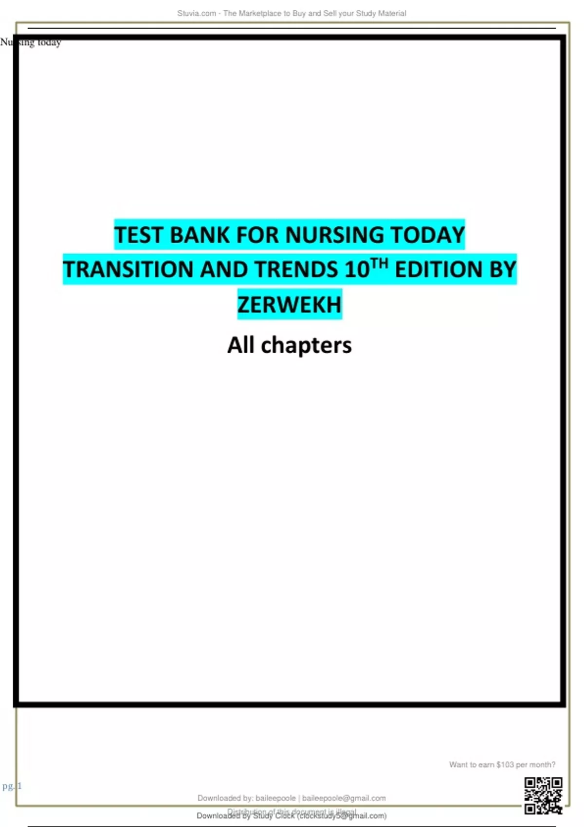 TEST BANK FOR NURSING TODAYTRANSITION AND TRENDS 10TH EDITIONBY ZERWEKH (All chapters) 1. A graduate nurse has been hired as a nurse at a local hospital. The new nurse is in the . honeymoon phase of role transition when making which of the following statements? a. “I am so nervous about being on my own as a nurse.” b. “This will be a great learning experience.” . c. “I can’t wait to have a steady paycheck.” d. “This job is perfect. I can finally do things my own way.” ANS: D . The honeymoon phase is when the student nurse sees the world of nursing as quite rosy. Often, the new graduate is fascinated with the thrill of arriving in the profession. Reality shock occurs when one moves into the workforce after several years of educational preparation. Recovery and resolution occur when the graduate nurse is able to laugh at . encountered situations. During this time, tension decreases, perception increases, and the nurse is able to grow as a person. . PTS: 1 DIF: Cognitive Level: Application/Applying REF: Table 1.1 OBJ: Identify the characteristics of reality shock. TOP: Reality shock MSC: NCLEX®: Safe and effective care environment . 2. Which of the following actions by the graduate nurse is an inappropriate methodology to recover from reality shock? a. Networking . b. Obtaining a mentor c. Returning to school d. Joining a support group . ANS: C The transition period is successfully managed when the graduate is able to evaluate the work situation objectively and predict effectively the actions and reactions of other staff. Nurturing the ability to see humor in a situation may be a first step. Returning to school is a positive step . after the graduate has worked through role transition, has some clinical experience, and is ready to focus on a new career objective. Networking, obtaining a mentor, and joining a support group would give the graduate nurse an opportunity to talk to others experiencing the . Downloaded by: baileepoole | Distribution of this document is illegal Want to earn $103 per month? Downloaded by Study Clock () lOMoARcPSD| S - The Marketplace to Buy and Sell your Study Material Nursing today pg. 3 stress associated with reality shock. The nurse would benefit from “talking through” issues and learning how to cope. PTS: 1 DIF: Cognitive Level: Application/Applying . REF: p. 9 OBJ: Describe methods to promote a successful transition. TOP: Reality shock MSC: NCLEX®: Safe and effective care environment Not applicable . 3. A nurse is trying to avoid burnout. Which of the following actions is a valid way to achieve this? a. Refusing to constantly work extra shifts . b. Withdrawing from peer support group c. “Going native” d. Changing jobs every 6 to 12 months . ANS: A One of the quickest ways to experience burnout is to “overwork the overtime.” Set priorities with your mental and physical health being the highest priority. Learning to say “no” to extra shifts is a positive means of coping of avoiding burnout. “Going native” is the term that . describes how recent graduates begin to copy and identify the reality of their role-transition experience by rejecting the values from nursing school and functioning more like a team member at their place of employment. Withdrawing from peer support groups, “going native,” . and changing jobs every 6 to 12 months would increase the chance of the nurse experiencing burnout. The nurse should instead focus on his/her practice and seek out support from other nurses. . PTS: 1 DIF: Cognitive Level: Application/Applying REF: p. 7 OBJ: Describe methods to promote a successful transition. TOP: Reality shock MSC: NCLEX®: Safe and effective care environment Not applicable . 4. Which of the following statements by the graduate nurse shows an understanding of reality shock as it applies to nursing? . a. “Reality shock is the period when a person moves from school into the b. workforce.”“Reality shock is the realization that practice and education are not the same.” c. “Reality shock is the period from graduation to becoming an experienced nurse.”. d. “Reality shock is a transition phase that new graduates go through before changing jobs.” ANS: A . Downloaded by: baileepoole | Distribution of this document is illegal Want to earn $103 per month? Downloaded by Study Clock () lOMoARcPSD| S - The Marketplace to Buy and Sell your Study Material Nursing today pg. 4 “Reality shock” is a term often used to describe the reaction experienced when one moves into the workforce after several years of educational preparation. The new graduate is caught in the situation of moving from a familiar, comfortable educational environment into a new role in . the workforce where the expectations are not clearly defined or may not even be realistic. The realization that practice and nursing school are not the same is often associated with “going native.” When nurses move from one position to another, they have already experienced reality shock. Becoming an experienced nurse takes time and is not part of the definition of . reality shock. PTS: 1 DIF: Cognitive Level: Application/Applying . REF: p. 5 OBJ: Identify the characteristics of reality shock. TOP: Reality shock MSC: NCLEX®: Not applicable 5. A student in the last semester of nursing school has established a goal of making a successful . role transition to graduate nurse. Which statement by the student indicates his/her understanding of how to achieve this goal? a. “I should care for increased numbers of patients to enhance work organization skills.” . b. “I will observe staff nurses as they perform nursing procedures to refine technique.” c. “I should seek increasingly close guidance from the nursing instructor to reduce . errors.” d. “I will evaluate my progress every 7 weeks or more to allow time for growth.” ANS: A It is important for the student to start taking care of increased numbers of patients to help with . time management and