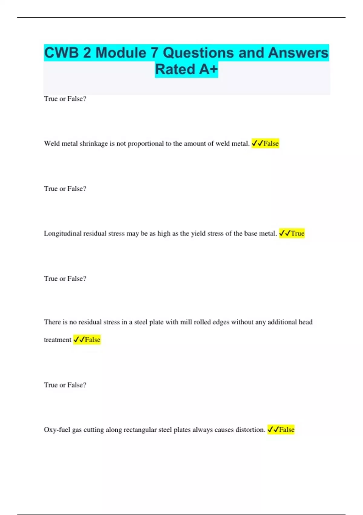 CWB 2 Module 7 Questions and Answers Rated A+ True or False? Weld metal shrinkage is not proportional to the amount of weld metal. False True or False? Longitudinal residual stress may be as high as the yield stress of the base metal. True True or False? There is no residual stress in a steel plate with mill rolled edges without any additional head treatment False True or False? Oxy-fuel gas cutting along rectangular steel plates always causes distortion. False What is the following formula applicable to? S = 0.18 Aw / t + 0.05d Transverse shrinkage - butt welds What is the following formula applicable to? S = 0.025 Aw / Ar Longitudinal shrinkage - butt welds In seam welding, what is the simplest form of distortion control? Start at the same distance from the end of the joint, making a short weld first True or False? Where planting and stiffeners are combined as a ship bulkhead work, the butt and seam welds in plating should be welded before the stiffeners. True True or False? In filling up a weld joint, the number of weld passes does not affect distortion. False True or False? Arc travel speed does not affect the amount of distortion. False True or False? The heat distribution around the welding arc is the same regardless of its travel speed. False Distortion may be partially or fully controlled by mechanical means using: A) Rigid clamping or fixturing B) Pre-bending or setting C) Pre-weld heat treatment D) Post-weld heat treatment E) Subassembly F) A, B, and C F) A, B, and C True or false? In a welded assembly with both groove and fillet welds, the fillet welds should be completed first and then the groove welds. False What is the advantage of intermittent fillet welds? Less distortion What is the advantage of using sub-assemblies when feasible? Reduces cumulative tolerances, easy to handle for large structures True or False? Balancing welds about the neutral axes can reduce distortion. True True or False? Reducing the root opening of a groove joint can reduce shrinkage. True Is rigid alignment and complete joint restraint by strongbacks, clamps, and similar devices a recommended practice? No True or False? Excessive root face in plate edge preparation should be avoided True The contraction effects in the weld metal that are of greater magnitude and, therefore, more serious are: A) Longitudinal B) Transverse B) Transverse What is the maximum temperature in heat straightening or forming of low alloy steels? 650°C True or False? When a heated member cools non-uniformly, the portions that cool first go into compression and the portions that cool last, go into tension. True True or False? In flame forming, if the temperature is much higher than 650°C it can cause damage to the base metal. True In flame straightening, if the temperature if too low the member will not be straightened. Why? Insufficient to produce upsetting In flame straightening or forming of low alloy steel members, what colour should be watched for? A dull or cherry red colour