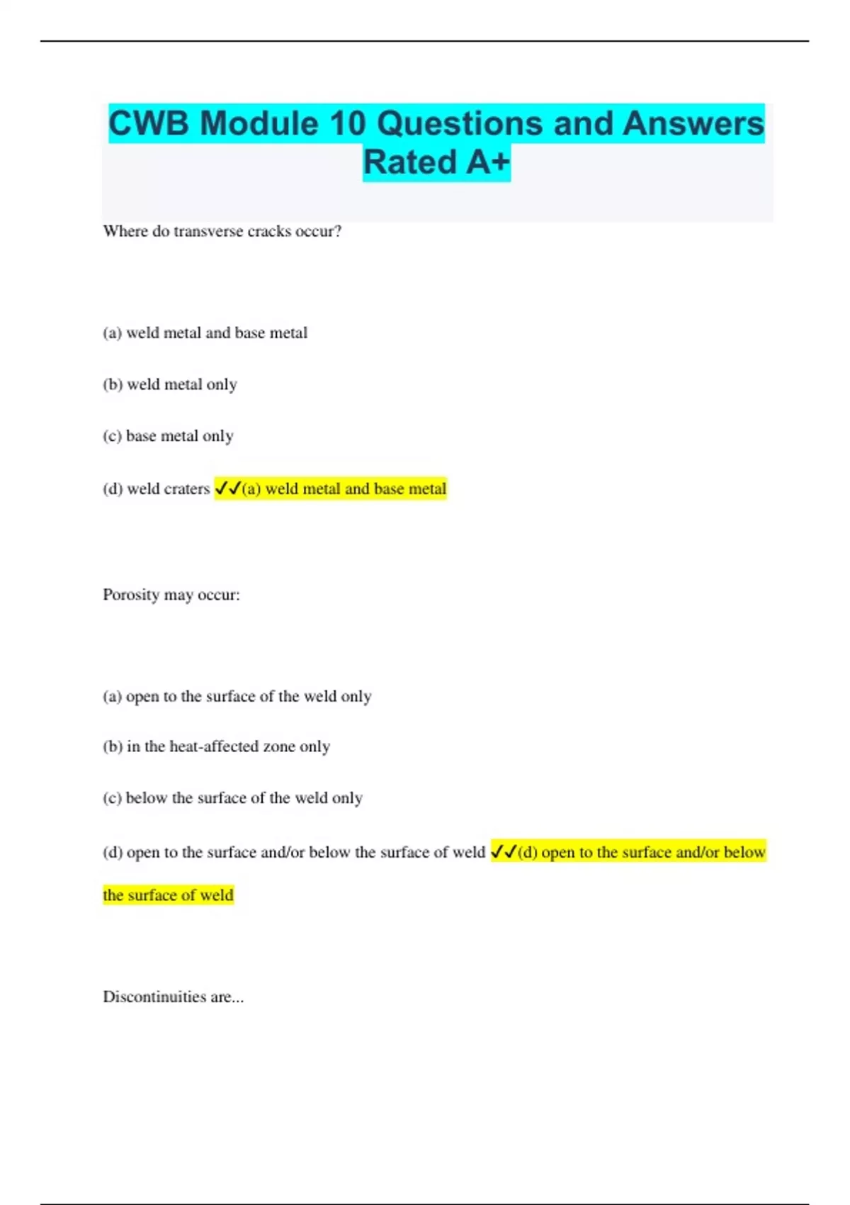 CWB Module 10 Questions and Answers Rated A+ Where do transverse cracks occur? (a) weld metal and base metal (b) weld metal only (c) base metal only (d) weld craters (a) weld metal and base metal Porosity may occur: (a) open to the surface of the weld only (b) in the heat-affected zone only (c) below the surface of the weld only (d) open to the surface and/or below the surface of weld (d) open to the surface and/or below the surface of weld Discontinuities are... (a) unwanted defects (b) interruptions in the desirable physical structure of the weld (c) welds that are undesirable (d) welds that may cause harm to the structure (b) interruptions in the desirable physical structure of the weld A defect is: (a) an undesirable interruption of a weld (b) a dimensional error that needs to be corrected (c) a discontinuity that represents a danger to fitness for service of weld or structure (d) an interruption in the desirable physical structure of the weld (c) a discontinuity that represents a danger to fitness for service of weld or structure Fitness for service is a concept of weld evaluation that seeks a balance between (a) reliability and economy of welding procedure (b) quality of welding procedure (c) quality and reliability of welding procedure (d) quality, reliability and economy of welding procedure (d) quality, reliability and economy of welding procedure Weld discontinuities are divided into these general classes (a) process or procedure related, metallurgical, and design related (b) process related, material, and conception (c) metallurgical and design related (d) procedure related, design related (a) process or procedure related, metallurgical, and design related Dimensional errors are the direct result of (a) poor shop instructions (b) untrained employee (c) poor workmanship in operations (d) poor quality control (c) poor workmanship in operations Working with CSA Standard W59 or AWS D1.1 a groove angle specified on a drawing as 60 degree is required to be between (a) 60 - 65 degree (b) 55 - 70 degree (c) 55 - 60 degree (d) 60 - 70 degree (b) 55 - 70 degree Working with CSA Standard Z662 a groove angle specified on a drawing as 60 degrees is required to be between (a) 60 - 65 degree (b) 55 - 70 degree (c) 55 - 60 degree (d) 60 - 80 degree (d) 60 - 80 degree CSA Z662 requires that abutting ends be aligned, the maximum allowable offset as specified for components with the same nominal wall thickness at the bevel is (a) 2 mm (b) 1.6 mm (c) 1 inch (d) 1/2 inch (b) 1.6 mm Depending on the condition of the shear blades and lubricants used, various foreign materials may be entrapped leading to (a) porosity and incomplete joint penetration (b) insufficient effective throat thickness (c) porosity, slag entrapment and incomplete fusion (d) slag entrapment and incomplete fusion (c) porosity, slag entrapment and incomplete fusion When oxygen is used in oxyfuel cutting, there is the potential for notches and irregularities to occur. Slag may adhere to these notches and surfaces. If not removed prior to welding the following discontinuities may occur (a) slag entrapment and incomplete fusion (b) porosity and incomplete joint penetration (c) porosity, incomplete fusion, slag entrapment and chemical composition defects (d) porosity and chemical defects (c) porosity, incomplete fusion, slag entrapment and chemical composition defects When cutting high-strength quenched and tempered steel, a localized martensitic microstructure forms along the edge of the cut surface from the localized heating and fast cooling associated with the cutting process. It may be necessary to remove up to (a) 5 mm of material by mechanical means to remove the hard, heat-affected zone (b) 1 inch of material by mechanical means to remove the hard, heat-affected zone (c) 1/2 inch of material by mechanical means to remove the hard, heat-affected zone (d) 2 mm of material by mechanical means to remove the hard, heat-affected zone (d) 2 mm of material by mechanical means to remove the hard, heat-affected zone According to CSA W59 and Z662, in preparation of material, surfaces and edges to be welded shall be (a) clean (b) smooth, uniform and free from fins, tears, cracks, and other defects (c) clean and constant size (d) smooth and clean (b) smooth, uniform and free from fins, tears, cracks, and other defects Surfaces to be welded shall be free from loose or thick scale, slag, rust, paint, grease, moisture, and other foreign material within (a) 12 mm (1/2 in) (b) 25 mm (1 in) (c) 50 mm (2 in) (d) 38 mm (1.5 in) (c) 50 mm (2 in) Occasional notches, not more than 5mm (3/16 in) deep shall be removed (a) by cleaning and adding weld (b) by machining or grinding (c) gouging and welding (d) adding weld deposit (b) by machining or grinding Occasional notches, exceeding 5mm (3/16 in) deep and less than 10 mm (3/8 in) deep shall be removed (a) by welding with the Engineer's approval (b) by machining or grinding (c) gouging and welding (d) adding weld deposit (a) by welding with the Engineer's approval In preparation, for material 100 mm (4 in) thick or over the depth of the notch shall not exceed (a) 5 mm ( 3/16 in) (b) 10 mm (3/8 in) (c) 15 mm (9/16 in) (d) 12 mm (1/2 in) (c) 15 mm (9/16 in) Overlap is a condition where (a) an excess of weld metal exists (b) an excess of weld metal deposit in convexity (c) an excess of weld metal exists at the toe of a weld beyond the limits of fusion (d) a reduce amount of weld metal exists (c) an excess of weld metal exists at the toe of a weld beyond the limits of fusion Overlap has the ability to mask (a) weld reinforcement (b) complete joint penetration (c) incomplete fusion (d) incomplete joint penetration (c) incomplete fusion If the nature of overlap is examined, it will be found that there is a (a) complete joint penetration (b) mass of weld reinforcement (c) mass of weld metal that is fused to the parent metal (d) mass of weld metal that is not fused to the parent metal (d) mass of weld metal tha