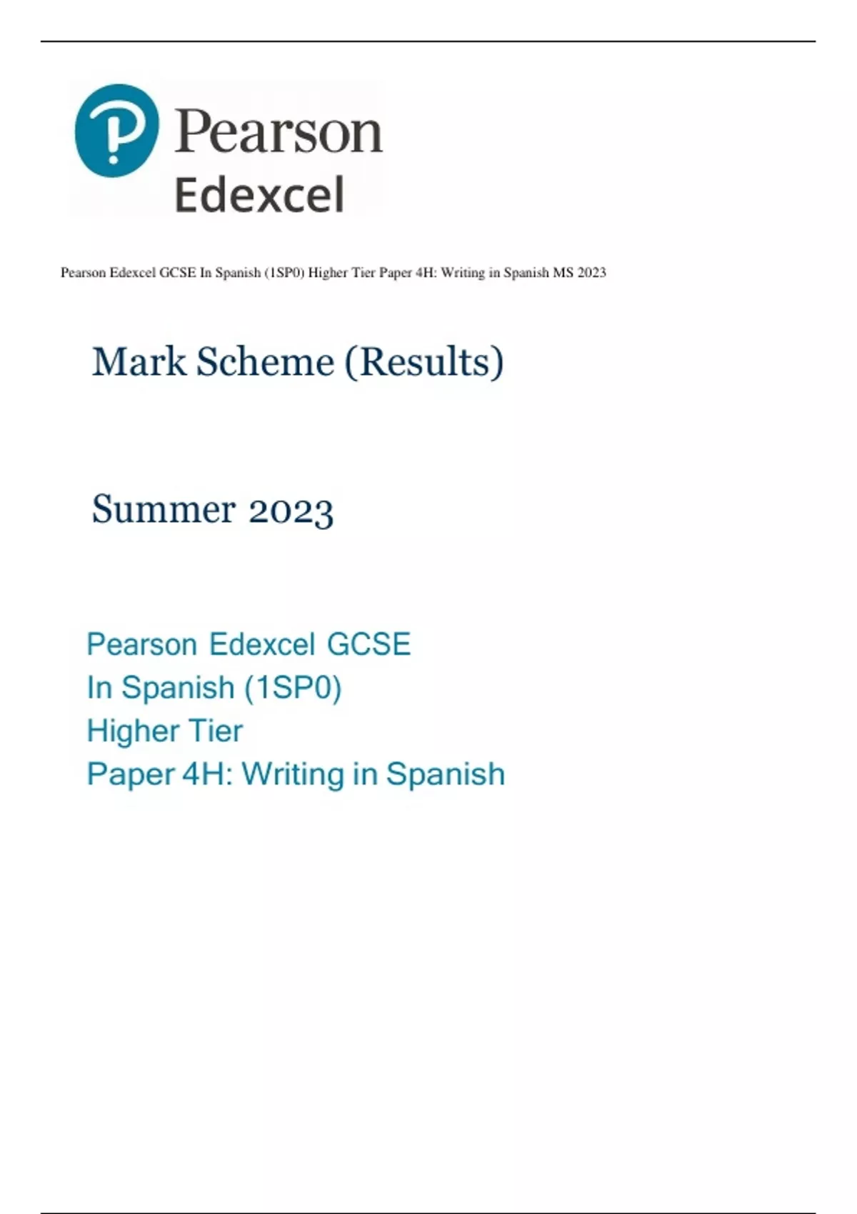 Pearson Edexcel GCSE In Spanish (1SP0) Higher Tier Paper 4H: Writing in Spanish MS 2023