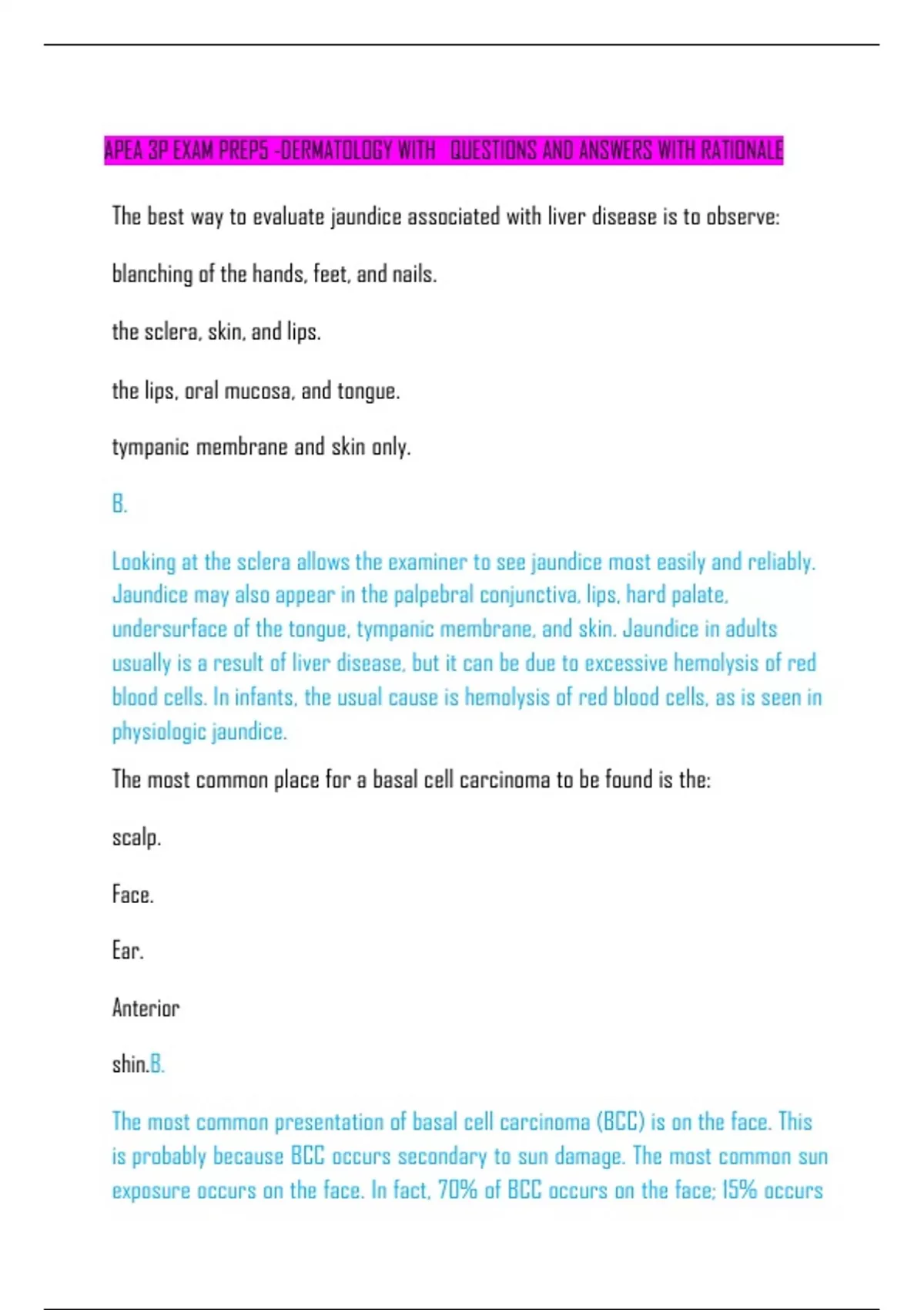 APEA 3P EXAM PREP5 -DERMATOLOGY WITH QUESTIONS AND ANSWERS WITH RATIONALE The best way to evaluate jaundice associated with liver disease is to observe: blanching of thehands, feet, andnails. thesclera, skin,andlips. the lips, oral mucosa, and tongue. tympanic membrane and skin only. B. Looking at the sclera allows the examiner to see jaundice most easily and reliably. Jaundice may also appear in the palpebral conjunctiva, lips, hard palate, undersurface of the tongue, tympanic membrane, and skin. Jaundice in adults usually is a result of liver disease, but it can be due to excessive hemolysis of red blood cells. In infants, the usual cause is hemolysis of red blood cells, as is seen in physiologicjaundice. The most common place for a basal cell carcinoma to be found is the: scalp. Face. Ear. Anterior shin.B. The most common presentation of basal cell carcinoma (BCC) is on the face. This is probably because BCC occurs secondary to sun damage. The most common sun exposure occurs on the face. In fact, 70% of BCC occurs on the face; 15% occurs onthetrunk. Impetigo is characterized by: honey-colored ry scales. marble-like lesions. wheals with pus. A. Impetigo is a superficial bacterial infection of the skin characterized by honeycolored crusts. Another form of impetigo is characterized by the presence of bullae.These infections are treated with topical antibiotics, good hygiene, and frequent hand washing. It is usually caused by Staphylococcus or Group A Streptococcus. A patient was burned with hot water. He has several 2-3 cm fluid-filled lesions. What arethesetermed? Vesicle sBullae Cysts Wheals B. Bullae are fluid-filled lesions that are greater than 6 mm in diameter. These are common in patients who have a superficial partial-thickness burn. Vesicles are also fluid filled, but they are smaller than 5 mm in diameter. A cyst is enclosed in a sac that can contain fluid or gelatinous material. Wheals are erythematous, irregular raised areas on the skin. All of these are termed primary lesions. A topical treatment forbasal cell carcinoma is: sulfacetamide lotion. 5-fluorouracil. tetracycline lotion. trichloroacetic acid. B. Several treatments exist for basal and squamous cell carcinoma. The majority are simple procedures like cryotherapy, electrodessication, surgical excision, and a topical treatment like 5-fluorouracil (5-FU). The other agents listed are not used to treat basal or squamous cell carcinoma. 5-FU works by inhibiting DNA synthesis. It iseffective if used for superficial basal cell carcinomas. It is available in cream and solutionandis usually applied twicedaily for 3-6 weeks. A 74-year-old male patient has sustained a laceration to his foot. His last tetanus shot was more than 10 years ago. He has completed the primary series. What shouldberecommended? Tetanustoxoidonly Tetanus and diphtheria only Hisprimary series willprotect him. Tetanus,diphtheria, and acellularpertussis (Tdap) D. More than 10 years has elapsed since this patient’s last tetanus shot. He needs another one. Tdap is specifically indicated for adolescents, older adults, healthcareproviders, and third trimester pregnant patients who have completed a primary series. Tetanus toxoid is indicated in the rare adult or child who is allergic to the aluminum adjuvant in the Tdimmunization. 7- A patient presents with small vesicles on the lateral edges of his fingers and intense itching. On close inspection, there are small vesicles on the palmar surface of thehand. What is this called? Seborrheic dermatitis Dyshidrotic dermatitisHerpes zoster Varicella zoster B. This dermatitis is intensely pruritic and involves the palms and soles and lateral aspects of the fingers. Over a couple of weeks, the vesicles desquamate. Recurrences are common. Seborrheic dermatitis affects only hairy areas of the body.The vesicles might raise suspicion of a viral infection, but this is not present in this case.