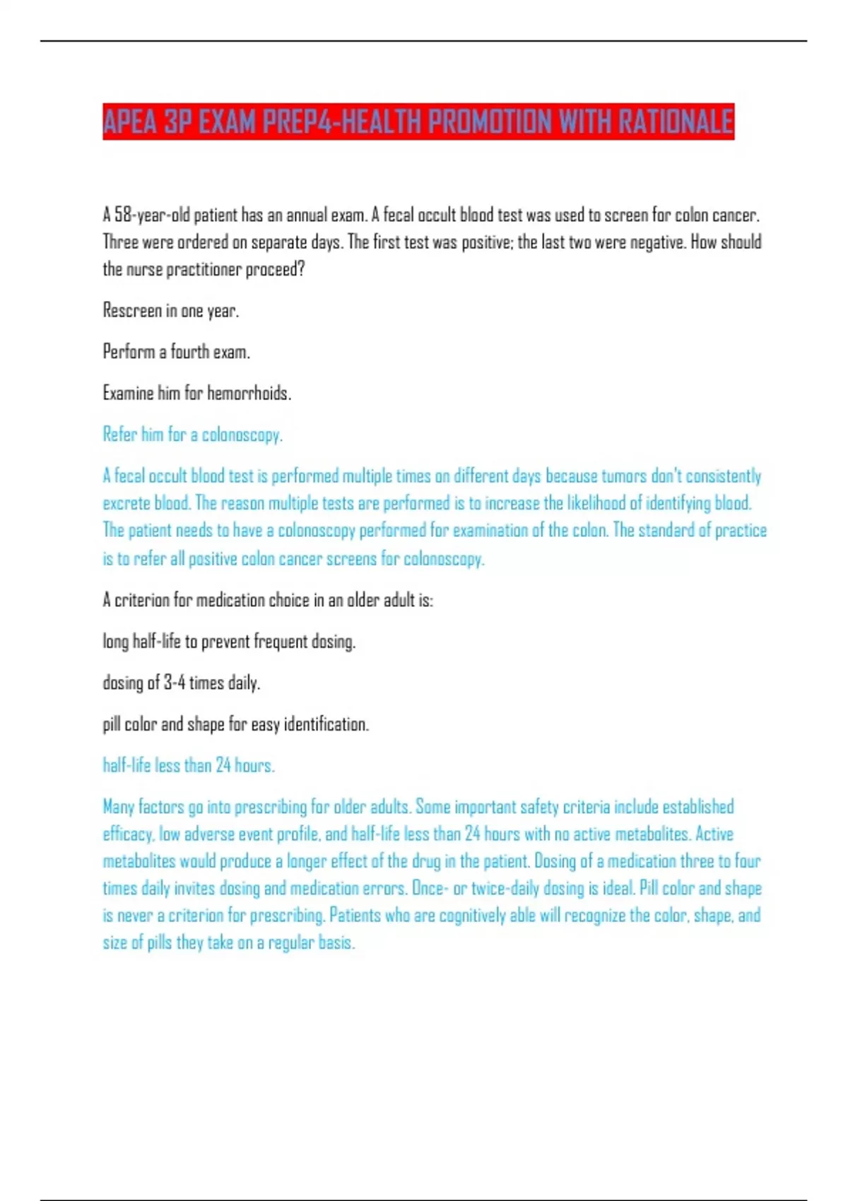 APEA 3P EXAM PREP4-HEALTH PROMOTION WITH RATIONALE A 58-year-old patient has an annual exam. A fecal occult blood test was used to screen for colon cancer. Three were ordered on separate days. The first test was positive; the last two were negative. How should the nurse practitioner proceed? Rescreen in one year. Perform a fourth exam. Examine him for hemorrhoids. Refer him for a colonoscopy. A fecal occult blood test is performed multiple times on different days because tumors don’t consistently excrete blood. The reason multiple tests are performed is to increase the likelihood of identifying blood. The patient needs to have a colonoscopy performed for examination of the colon. The standard of practice is to refer all positive colon cancer screens for colonoscopy. A criterion for medication choice in an older adult is: long half-life to prevent frequent dosing. dosing of 3-4 times daily. pill color and shape for easy identification. half-life less than 24 hours. Many factors go into prescribing for older adults. Some important safety criteria include established efficacy, low adverse event profile, and half-life less than 24 hours with no active metabolites. Active metabolites would produce a longer effect of the drug in the patient. Dosing of a medication three to four times daily invites dosing and medication errors. Once- or twice-daily dosing is ideal. Pill color and shape is never a criterion for prescribing. Patients who are cognitively able will recognize the color, shape, and size of pills they take on a regular basis. What is the recommendation from American Cancer Society for assessment of the prostate gland in a man who is 45 years old and of average risk for development of prostate cancer? He should have: screening starting at 50 years of age. prostate-specific antigen (PSA) now. PSA and digital rectal exam now. digital rectal exam only. At age 50 years, males of average prostate cancer risk should have a PSA measurement with or without a digital rectal exam (DRE). If they are deemed to be of high risk because of a family history (first-degree relative with prostate cancer before age 65 years) or race (African American), screening discussions should take place at age 40-45 years. If the initial PSA is 2.5 ng/mL, annual testing should take place. If the initial PSA is 2.5 ng/mL, test every 2 years. A 75-year-old adult asks for the pneumonia vaccine. His immunization record indicates that he had one at age 65 and another a year later. What is the recommendation of the CDC about how the NP should handle his request? Revaccination is recommended now Revaccination is recommended every 5 years after age 65 years Do not revaccinate this patient at this time He should have received one at age 70 years The recommendation of CDC is NOT to revaccinate this patient. After initial vaccination with PCV13 at age 65 years and subsequent vaccination with PPSV23 1 year later, no revaccination is recommended in this patient. What should the nurse practitioner recommend to any elder taking medications? Have someone check your medications prior to taking them Never take your medicine on an empty stomach Keep a list of all of your medications with you. Have a pharmacist review your list once a year A list of current medications should be kept with each patient and carried with him, especially when healthcare visits are scheduled. Many older adults can take medications without supervision. Many medications should be taken without food (thyroid supplementation for example). A pharmacist can evaluate the list of medications for drug-drug interactions, but the pharmacist will not know the diagnoses and other reasons for choosing the medications. What temperature should be set on a water heater in the home of an older adult to prevent burn injury? Less than 110 degrees Less than 120 degrees Less than 130 degrees Less than 140 degrees Hot water heaters are common sources of burns in homes of older adults and very young patients. Many safety organizations in the United States believe that burns can be prevented if hot water heaters are set to less than 120° F. A patient who has been treated for hypothyroidism presents for her annual exam. Her TSH is 4.1 (normal = 0.4- 3.8). She feels well. How should she be managed? Continue her current dosage of thyroid replacement. Increase her replacement. Decrease her replacement. Repeat the TSH in 2-3 weeks. When an abnormal TSH is received, especially when a patient is not symptomatic, it should be repeated. Sometimes there are periods of transient hypothyroidism, lab error, and missed doses that can cause changes in TSH levels. A 20-year-old student has an MMR titer that demonstrates an unprotective titer for rubella. She is HIV positive. Her CD4 cell count is unknown. Which statement is true? She should not receive the MMR immunization because she is at low risk for the disease. MMR is safe to give but she does not need this. She is at risk for MMR but should not be immunized. She should receive this. The immunization is not alive. This patient is at risk for rubella because she does not have a sufficient titer. The MMR immunization is an attenuated virus. Though an attenuated immunization is weakened, it is still considered live and so is contraindicated in anyone who may be immunocompromised. Since her CD4 cell count is unknown, she should not receive this immunization yet. She may be able to receive this immunization if her CD4 count is normal. What choice below would be beneficial to a 76-year-old who takes daily oral steroids for COPD and now takes a daily aspirin for primary prevention of myocardial infarction? Screen for infection with H. pylori Daily proton pump inhibitor (PPI) Antacids PRN heartburn Daily use of low dose famotidine Aspirin does increase the risk of gastrointestinal bleeding, especially if it is given in combination with oral steroids. Most learned authorities and ACOVE (Assessing Care of Vulnerable Elders) agree that when two or mor