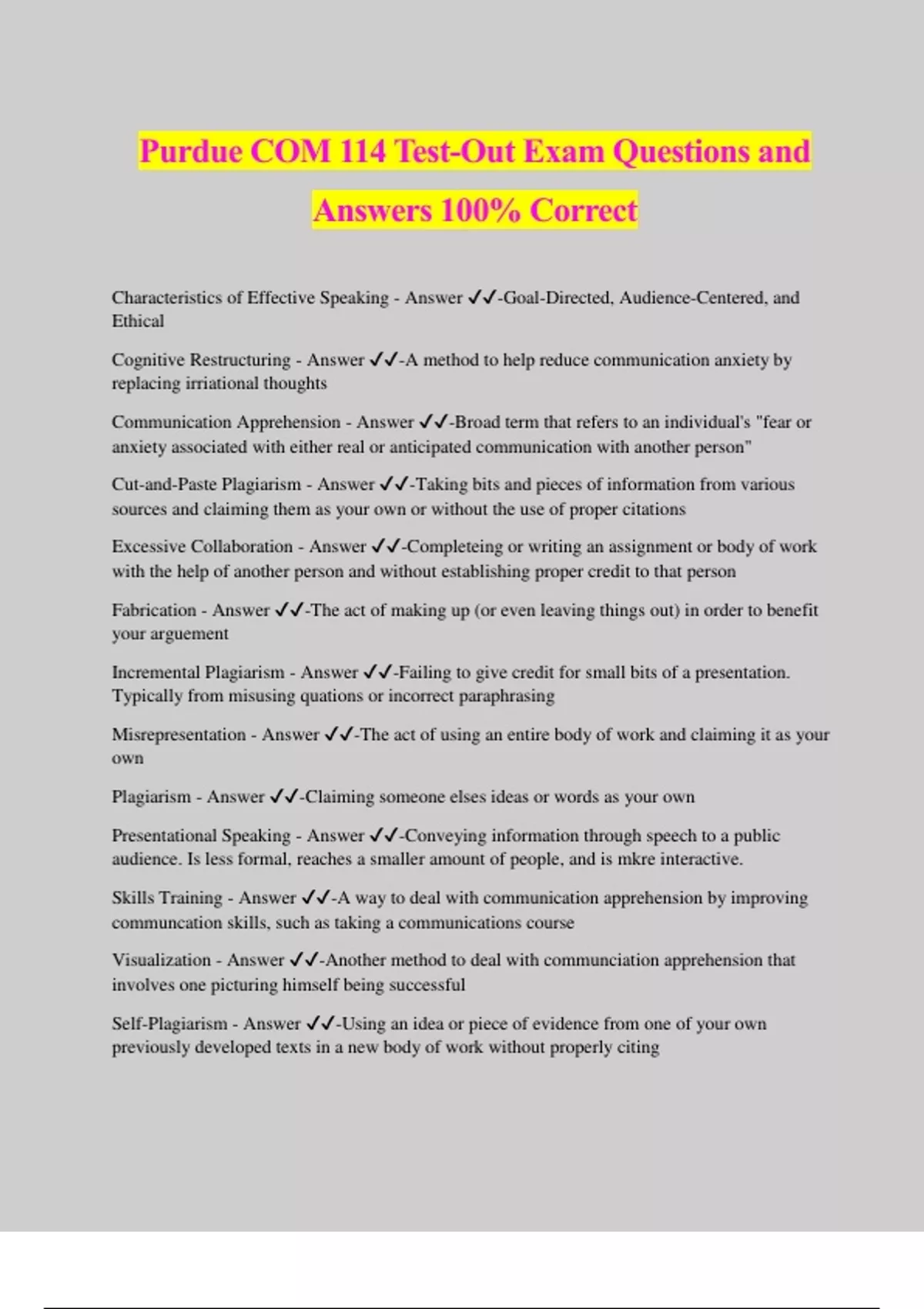 Purdue COM 114 Test-Out Exam Questions and Answers 100% Correct Characteristics of Effective Speaking - Answer ️️ -Goal-Directed, Audience-Centered, and Ethical Cognitive Restructuring - Answer ️️ -A method to help reduce communication anxiety by replacing irriational thoughts Communication Apprehension - Answer ️️ -Broad term that refers to an individual's "fear or anxiety associated with either real or anticipated communication with another person" Cut-and-Paste Plagiarism - Answer ️️ -Taking bits and pieces of information from various sources and claiming them as your own or without the use of proper citations Excessive Collaboration - Answer ️️ -Completeing or writing an assignment or body of work with the help of another person and without establishing proper credit to that person Fabrication - Answer ️️ -The act of making up (or even leaving things out) in order to benefit your arguement Incremental Plagiarism - Answer ️️ -Failing to give credit for small bits of a presentation. Typically from misusing quations or incorrect paraphrasing Misrepresentation - Answer ️️ -The act of using an entire body of work and claiming it as your own Plagiarism - Answer ️️ -Claiming someone elses ideas or words as your own Presentational Speaking - Answer ️️ -Conveying information through speech to a public audience. Is less formal, reaches a smaller amount of people, and is mkre interactive. Skills Training - Answer ️️ -A way to deal with communication apprehension by improving communcation skills, such as taking a communications course Visualization - Answer ️️ -Another method to deal with communciation apprehension that involves one picturing himself being successful Self-Plagiarism - Answer ️️ -Using an idea or piece of evidence from one of your own previously developed texts in a new body of work without properly citing