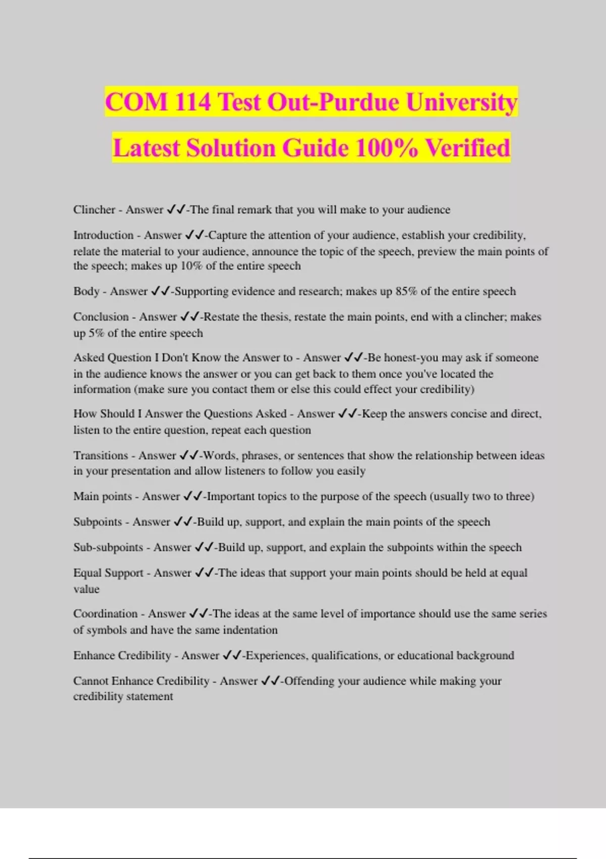 COM 114 Test Out-Purdue University Latest Solution Guide 100% Verified Clincher - Answer ️️ -The final remark that you will make to your audience Introduction - Answer ️️ -Capture the attention of your audience, establish your credibility, relate the material to your audience, announce the topic of the speech, preview the main points of the speech; makes up 10% of the entire speech Body - Answer ️️ -Supporting evidence and research; makes up 85% of the entire speech Conclusion - Answer ️️ -Restate the thesis, restate the main points, end with a clincher; makes up 5% of the entire speech Asked Question I Don't Know the Answer to - Answer ️️ -Be honest-you may ask if someone in the audience knows the answer or you can get back to them once you've located the information (make sure you contact them or else this could effect your credibility) How Should I Answer the Questions Asked - Answer ️️ -Keep the answers concise and direct, listen to the entire question, repeat each question Transitions - Answer ️️ -Words, phrases, or sentences that show the relationship between ideas in your presentation and allow listeners to follow you easily Main points - Answer ️️ -Important topics to the purpose of the speech (usually two to three) Subpoints - Answer ️️ -Build up, support, and explain the main points of the speech Sub-subpoints - Answer ️️ -Build up, support, and explain the subpoints within the speech Equal Support - Answer ️️ -The ideas that support your main points should be held at equal value Coordination - Answer ️️ -The ideas at the same level of importance should use the same series of symbols and have the same indentation Enhance Credibility - Answer ️️ -Experiences, qualifications, or educational background Cannot Enhance Credibility - Answer ️️ -Offending your audience while making your credibility statement