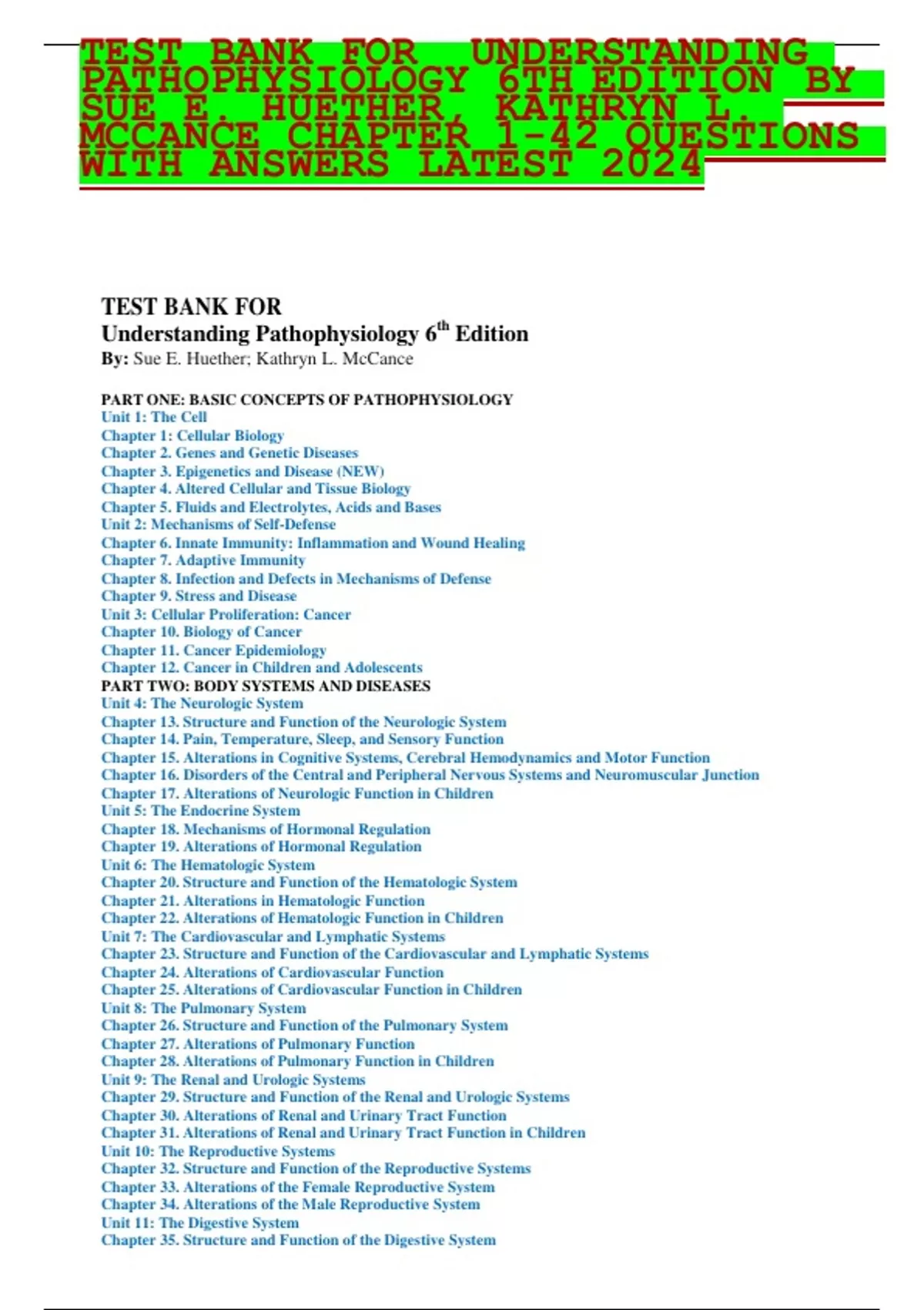 TEST BANK FOR UNDERSTANDING PATHOPHYSIOLOGY 6TH EDITION BY SUE E. HUETHER, KATHRYN L. MCCANCE CHAPTER 1-42 QUESTIONS WITH ANSWERS LATEST 2024