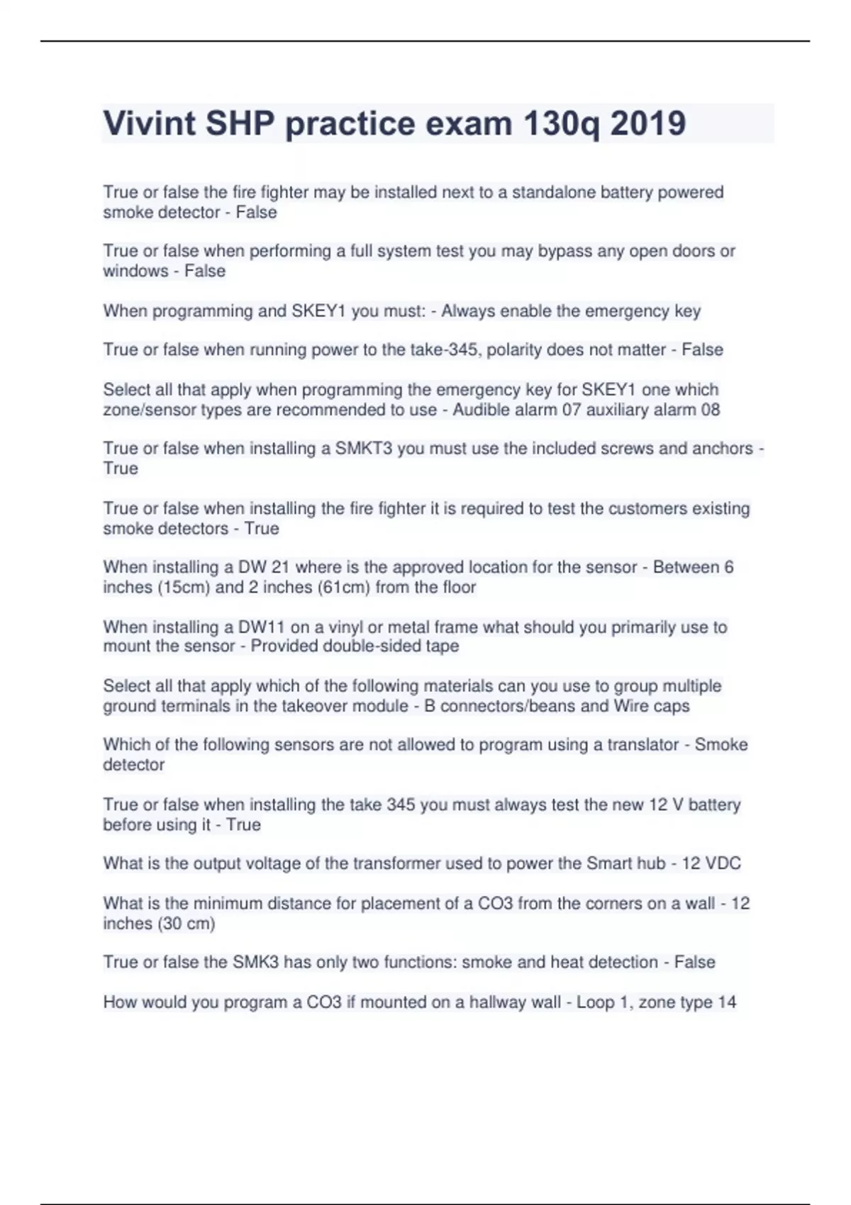 True or false the fire fighter may be installed next to a standalone battery powered smoke detector - False True or false when performing a full system test you may bypass any open doors or windows - False When programming and SKEY1 you must: - Always enable the emergency key True or false when running power to the take-345, polarity does not matter - False Select all that apply when programming the emergency key for SKEY1 one which zone/sensor types are recommended to use - Audible alarm 07 auxiliary alarm 08 True or false when installing a SMKT3 you must use the included screws and anchors - True True or false when installing the fire fighter it is required to test the customers existing smoke detectors - True When installing a DW 21 where is the approved location for the sensor - Between 6 inches (15cm) and 2 inches (61cm) from the floor When installing a DW11 on a vinyl or metal frame what should you primarily use to mount the sensor - Provided double-sided tape Select all that apply which of the following materials can you use to group multiple ground terminals in the takeover module - B connectors/beans and Wire caps Which of the following sensors are not allowed to program using a translator - Smoke detector True or false when installing the take 345 you must always test the new 12 V battery before using it - True What is the output voltage of the transformer used to power the Smart hub - 12 VDC What is the minimum distance for placement of a CO3 from the corners on a wall - 12 inches (30 cm) True or false the SMK3 has only two functions: smoke and heat detection - False How would you program a CO3 if mounted on a hallway wall - Loop 1, zone type 14