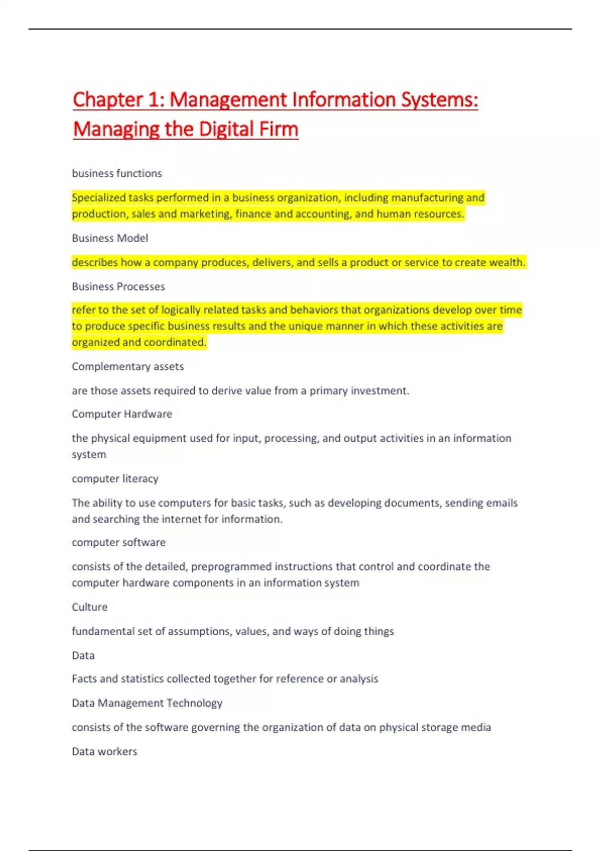 Business Model describes how a company produces, delivers, and sells a product or service to create wealth. Business Processes refer to the set of logically related tasks and behaviors that organizations develop over time to produce specific business results and the unique manner in which these activities are organized and coordinated. Complementary assets are those assets required to derive value from a primary investment. Computer Hardware the physical equipment used for input, processing, and output activities in an information system computer literacy The ability to use computers for basic tasks, such as developing documents, sending emails and searching the internet for information. computer software consists of the detailed, preprogrammed instructions that control and coordinate the computer hardware components in an information system Culture fundamental set of assumptions, values, and ways of doing things Data Facts and statistics collected together for reference or analysis Data Management Technology consists of the software governing the organization of data on physical storage media Data workers