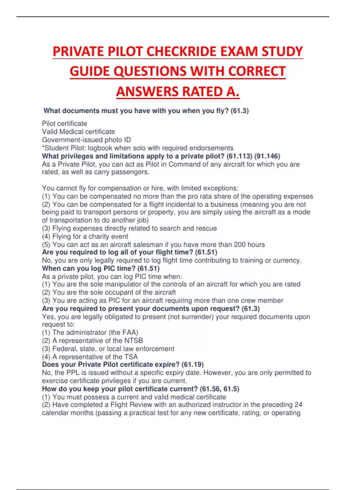 PRIVATE PILOT CHECKRIDE EXAM STUDY GUIDE QUESTIONS WITH CORRECT ANSWERS RATED A.