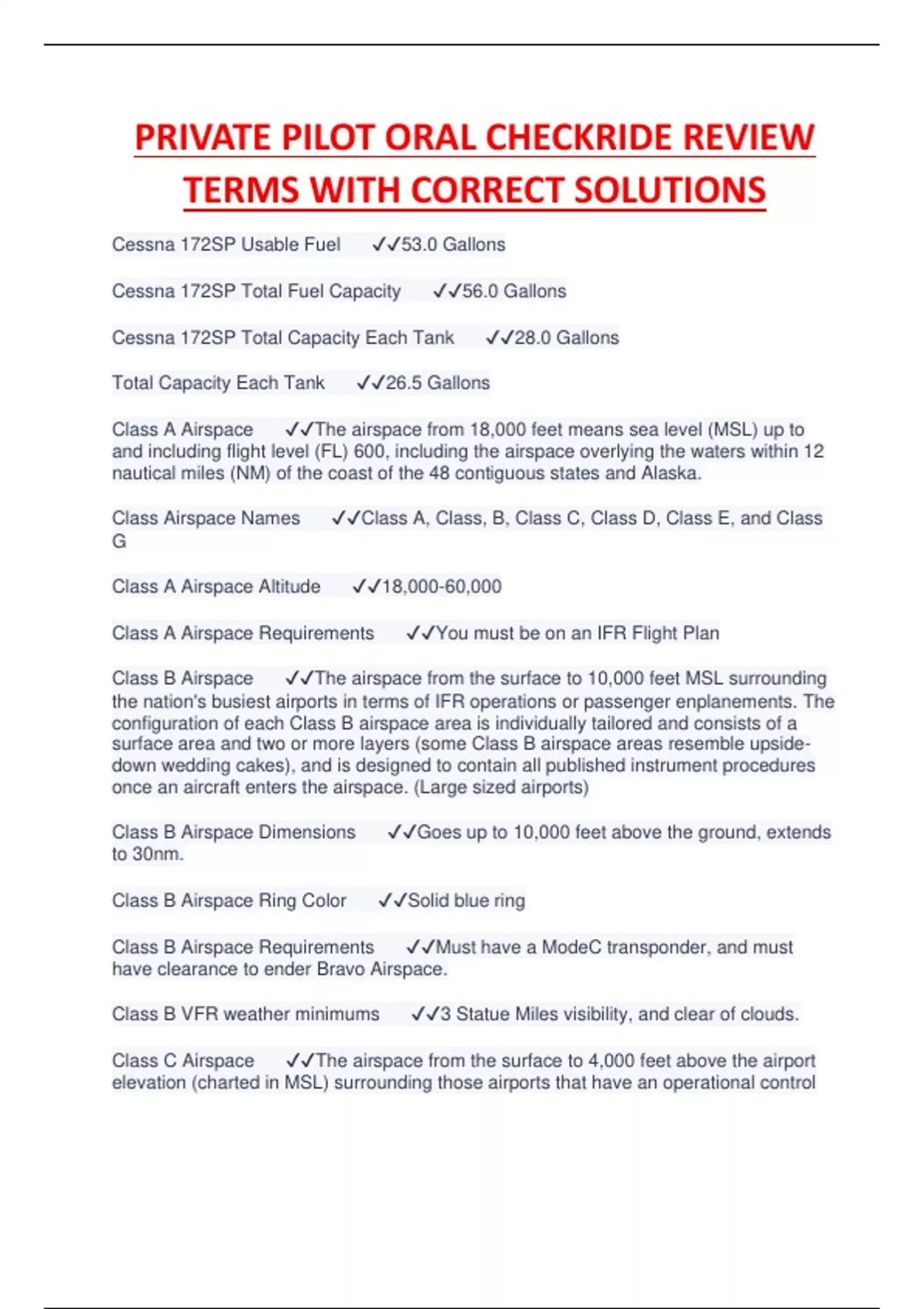 PRIVATE PILOT ORAL CHECKRIDE REVIEW TERMS WITH CORRECT SOLUTIONS