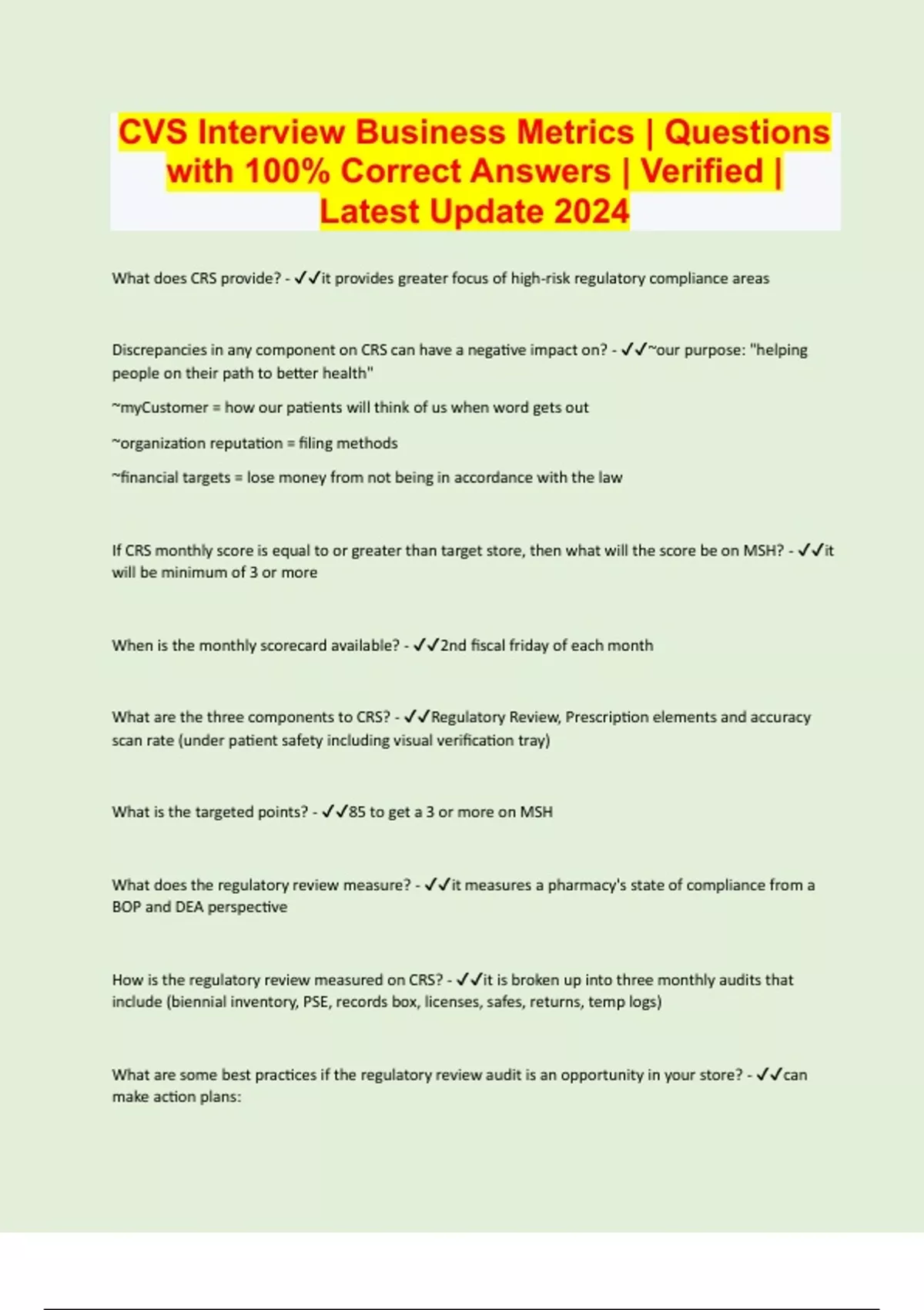 CVS Interview Business Metrics | Questions with 100% Correct Answers | Verified | Latest Update 2024