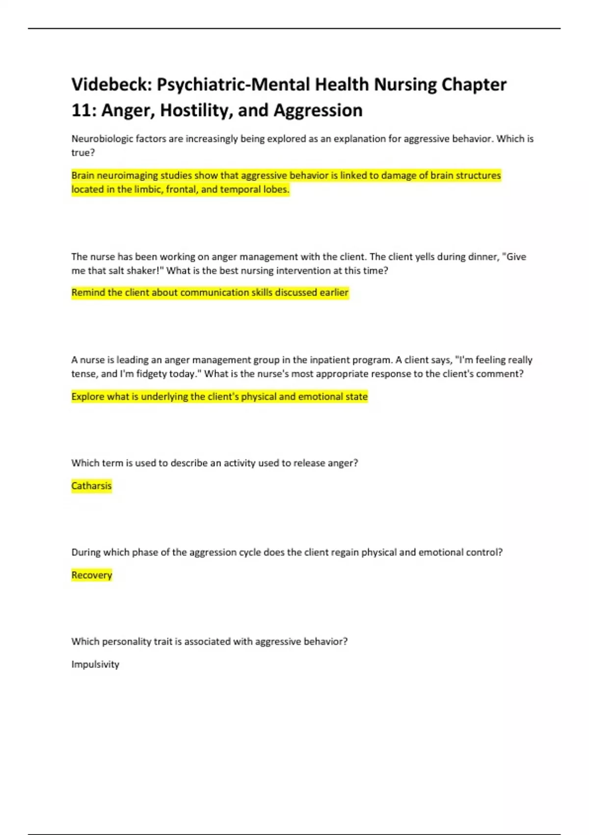 Videbeck: Psychiatric-Mental Health Nursing Chapter 11: Anger, Hostility, and Aggression Score A+