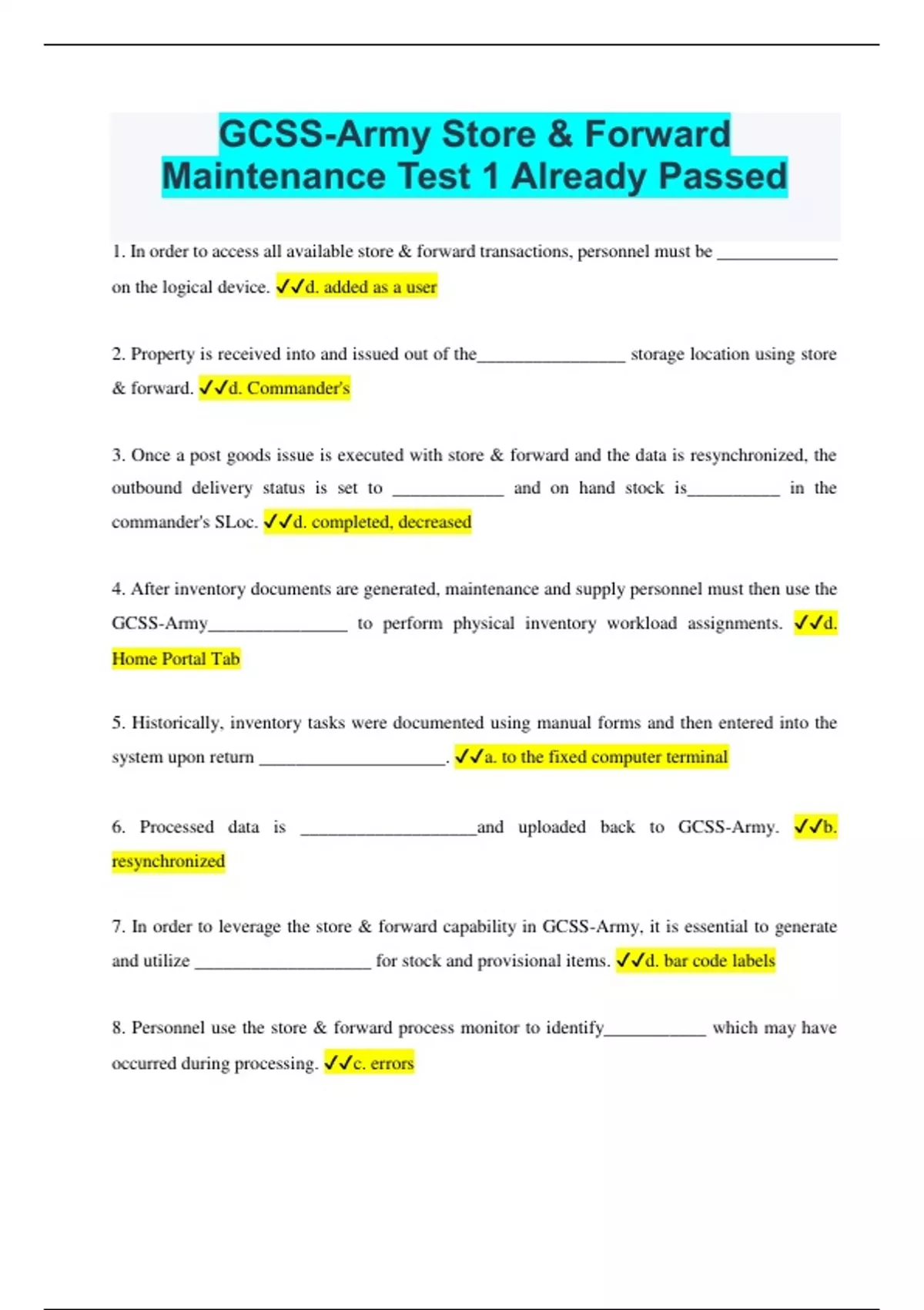 1. In order to access all available store & forward transactions, personnel must be _____________ on the logical device. d. added as a user 2. Property is received into and issued out of the________________ storage location using store & forward. d. Commander's 3. Once a post goods issue is executed with store & forward and the data is resynchronized, the outbound delivery status is set to ____________ and on hand stock is__________ in the commander's SLoc. d. completed, decreased 4. After inventory documents are generated, maintenance and supply personnel must then use the GCSS-Army_______________ to perform physical inventory workload assignments. d. Home Portal Tab 5. Historically, inventory tasks were documented using manual forms and then entered into the system upon return ____________________. a. to the fix