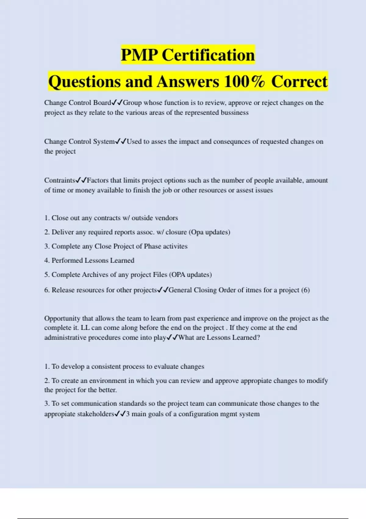 Change Control BoardGroup whose function is to review, approve or reject changes on the project as they relate to the various areas of the represented bussiness Change Control SystemUsed to asses the impact and consequnces of requested changes on the project ContraintsFactors that limits project options such as the number of people available, amount of time or money available to finish the job or other resources or assest issues 1. Close out any contracts w/ outside vendors 2. Deliver any required reports assoc. w/ closure (Opa updates) 3. Complete any Close Project of Phase activites 4. Performed Lessons Learned 5. Complete Archives of any project Files (OPA updates) 6. Release resources for other projectsGeneral Closing Order of itmes for a project (6) Opportunity that allows the team to learn from past experience and improve on the project as the complete it. LL can come along before the end on the project . If they come at the end administrative procedures come into playWhat are Lessons Learned? 1. To develop a consistent process to evaluate chang