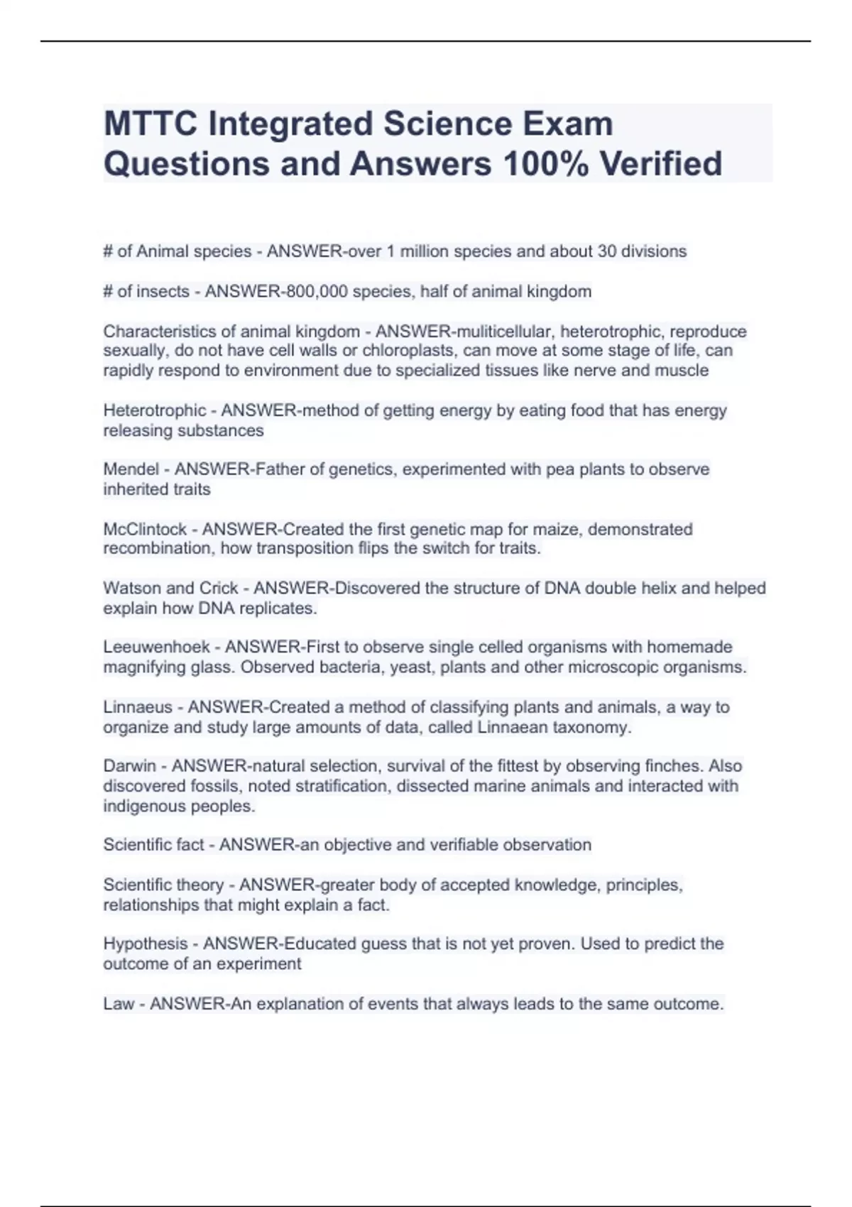 MTTC Integrated Science Exam Questions and Answers 100% VerifiedMTTC Integrated Science Exam Questions and Answers 100% VerifiedMTTC Integrated Science Exam Questions and Answers 100% Verified# of Animal species - ANSWER-over 1 million species and about 30 divisions # of insects - ANSWER-800,000 species, half of animal kingdom Characteristics of animal kingdom - ANSWER-muliticellular, heterotrophic, reproduce sexually, do not have cell walls or chloroplasts, can move at some stage of life, can rapidly respond to environment due to specialized tissues like nerve and muscle Heterotrophic - ANSWER-method of getting energy by eating food that has energy releasing substances