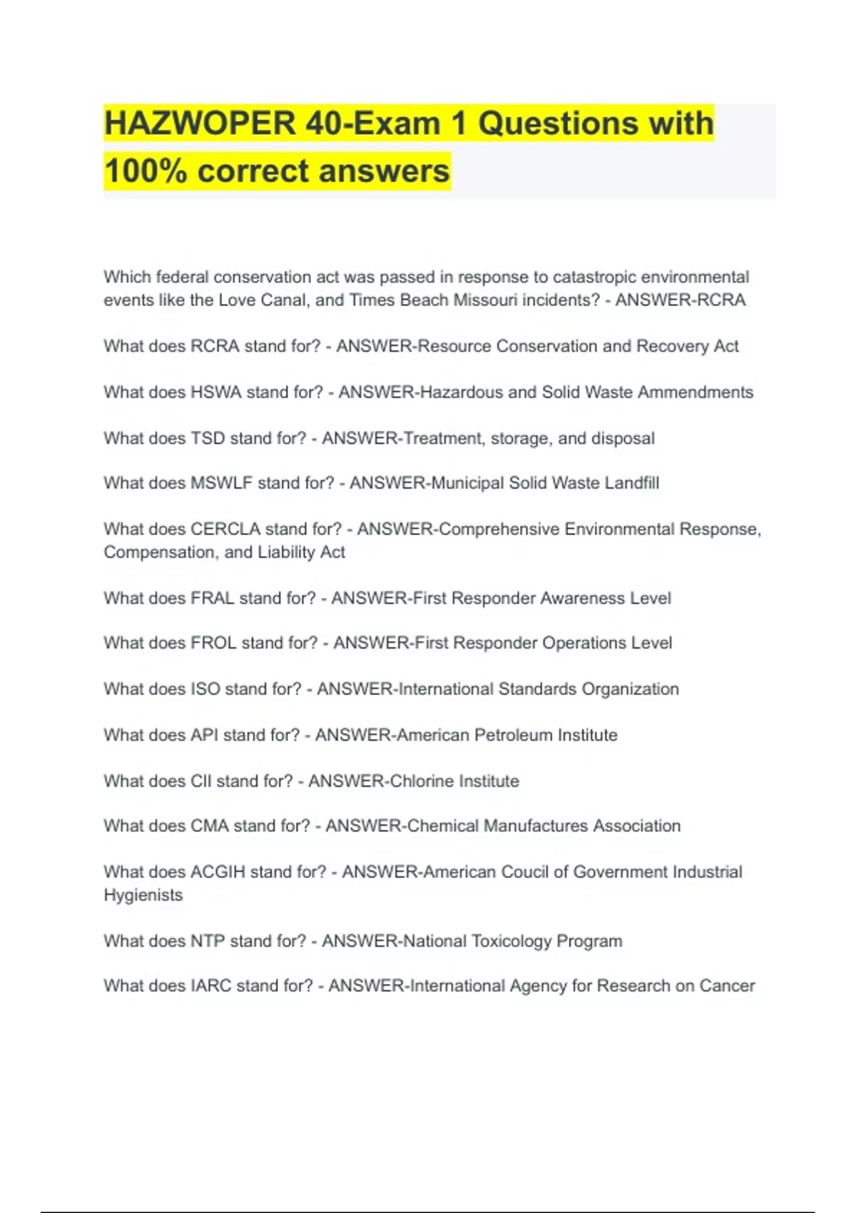 Which federal conservation act was passed in response to catastropic environmental events like the Love Canal, and Times Beach Missouri incidents? - ANSWER-RCRA What does RCRA stand for? - ANSWER-Resource Conservation and Recovery Act What does HSWA stand for? - ANSWER-Hazardous and Solid Waste Ammendments What does TSD stand for? - ANSWER-Treatment, storage, and disposal What does MSWLF stand for? - ANSWER-Municipal Solid Waste Landfill What does CERCLA stand for? - ANSWER-Comprehensive Environmental Response, Compensation, and Liability Act What does FRAL stand for? - ANSWER-First Responder Awareness Level What does FROL stand f