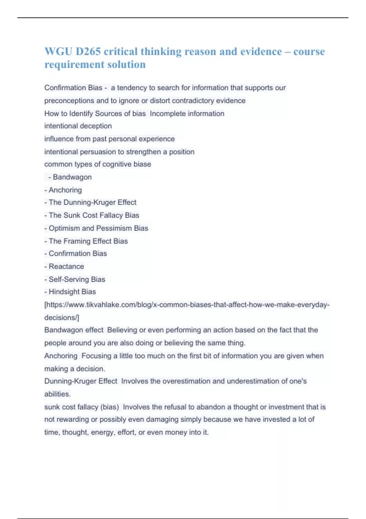 WGU D265 critical thinking reason and evidence – course requirement solution Confirmation Bias - a tendency to search for information that supports our preconceptions and to ignore or distort contradictory evidence How to Identify Sources of bias Incomplete information intentional deception influence from past personal experience intentional persuasion to strengthen a position common types of cognitive biase - Bandwagon - Anchoring - The Dunning-Kruger Effect - The Sunk Cost Fallacy Bias - Optimism and Pessimism Bias - The Framing Effect Bias - Confirmation Bias - Reactance - Self-Serving Bias - Hindsight Bias [ Bandwagon effect Believing or even performing an action based on the fact that the people around you are also doing or believing the same thing. Anchoring Focusing a little too much on the first bit of information you are given when making a decision. Dunning-Kruger Effect Involves the overestimation and underestimation of one's abilities. sunk cost fallacy (bias) Involves the refusal to abandon a thought or investment that is not rewarding or possibly even damaging simply because we have invested a lot of time, thought, energy, effort, or even money into it. Optimism and Pessimism Bias The tendency to overestimate how likely a positive outcome will occur, especially if we're in a good mood. We also have the tendency to overestimate the negative outcome of an event if we are not happy or in a bad mood. Framing Effect Involves drawing a number of different conclusions about something, based on the different ways the exact same data is presented. Reactance the need to do the opposite of what someone requests. Self-Serving Bias the tendency for people to take personal credit for success but blame failure on external factors Hindsight Bias the tendency to believe, after learning an outcome, that one would have foreseen it Principle of Charity Before we evaluate the validity or strength of an argument, we should try to interpret it in the best possible light. Why is it fundamental to understand the principle of charity? - One reason has to do with our goals in having reasoned discussions. - Another reason has to do with simple strategy, if you are indeed interested in winning a debate. - The final reason is a moral reason for following the principle of charity. Cognitive bias The way we naturally categorize and make sense of the world around us. Alief An automatic belief-like attitude that can explain how our instinctual responses can conflict with our reasoned-out beliefs. Why is it important to recognize cognitive bias? It can help to mitigate negative effects on our thinking. Awareness of learning common ways the human mind can go astray can help us avoid errors in our own reasoning and spot such errors in others' reasoning. Heuristic A rule of thumb, a ready strategy, or a shortcut Algorithm bubble The curated and personalized version of online reality that a website shows you when you log on. Availability heuristic A process where in the mind generalizes based on what is available to it rather than on what is objectively true. Irrational decision making allows irrelevant biases, emotions, and environment to influence our decisions