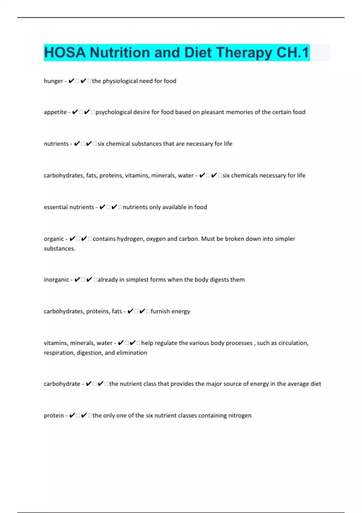 HOSA Nutrition and Diet Therapy CH.1 48 |Review | Questions with 100% Correct Answers | Verified | Latest Update
