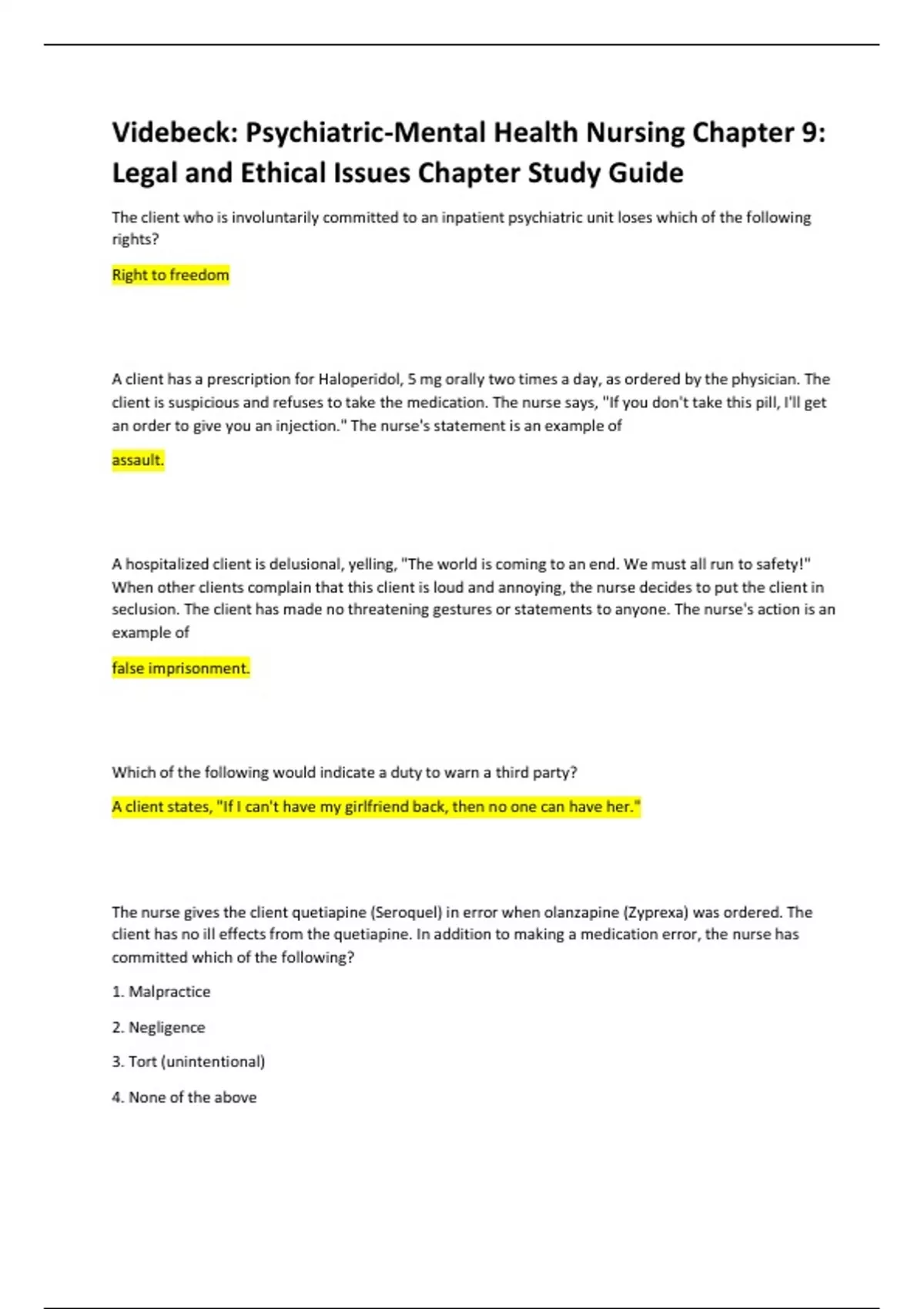 Videbeck: Psychiatric-Mental Health Nursing Chapter 9: Legal and Ethical Issues Chapter Study Guide