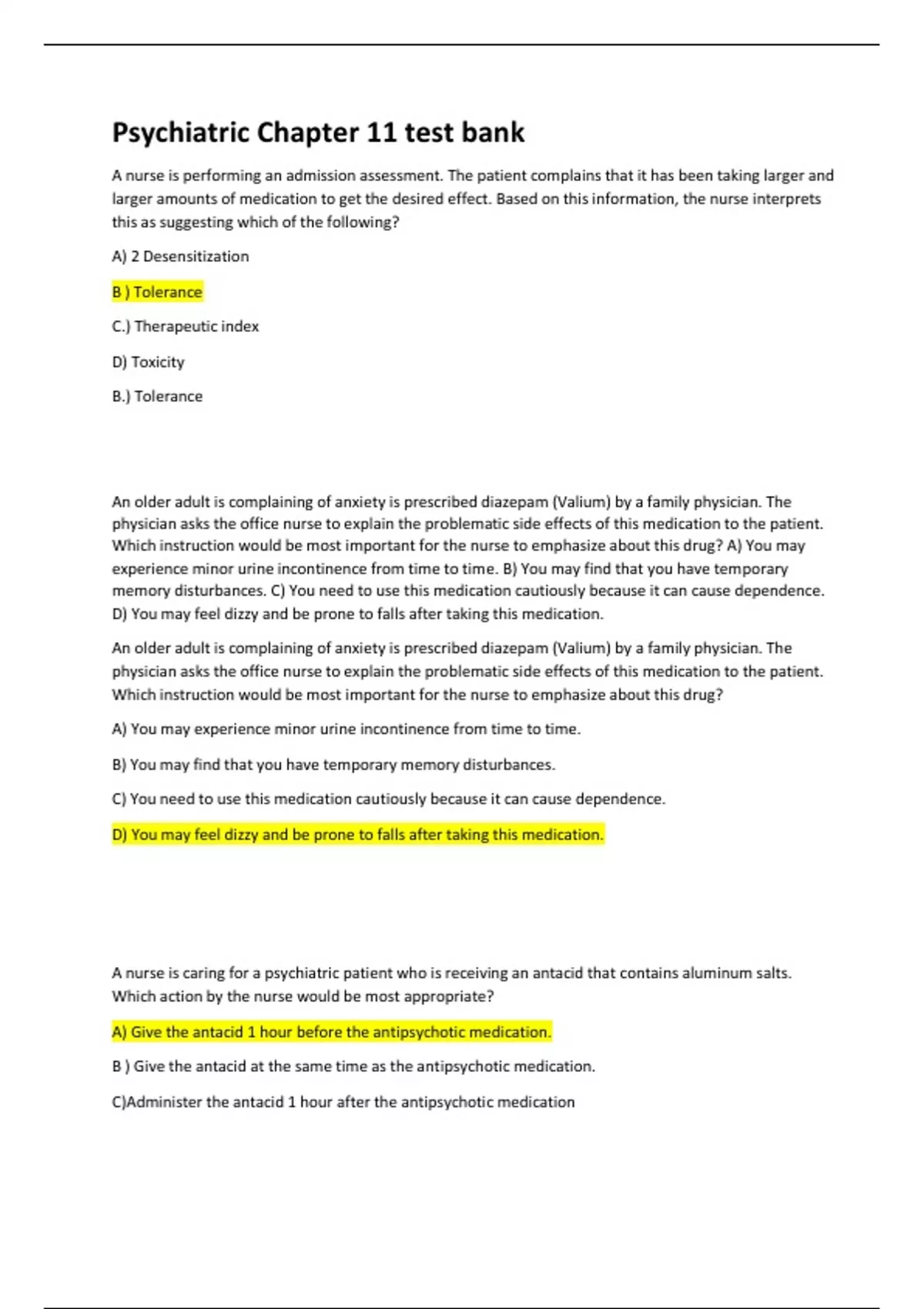 A nurse is performing an admission assessment. The patient complains that it has been taking larger and larger amounts of medication to get the desired effect. Based on this information, the nurse interprets this as suggesting which of the following? A) 2 Desensitization B ) Tolerance C.) Therapeutic index D) Toxicity B.) Tolerance An older adult is complaining of anxiety is prescribed diazepam (Valium) by a family physician. The physician asks the office nurse to explain the problematic side effects of this medication to the patient. Which instruction would be most important for the nurse to emphasize about this drug? A) You may experience minor urine incontinence from time to time. B) You may find that you have temporary memory disturbances. C) You need to use this medication cautiously because it can cause dependence. D) You may feel dizzy and be prone to falls after taking this medication. An older adult is complaining of anxiety is prescribed diazepam (Valium) by a family physician. The physician asks the office nurse to explain the problematic side effects of this medication to the patient. Which instruction would be most important for the nurse to emphasize about this drug? A) You may experience minor urine incontinence from time to time. B) You may find that you have temporary memory disturbances. C) You need to use this medication cautiously because it can cause dependence. D) You may feel dizzy and be prone to falls after taking this medication.