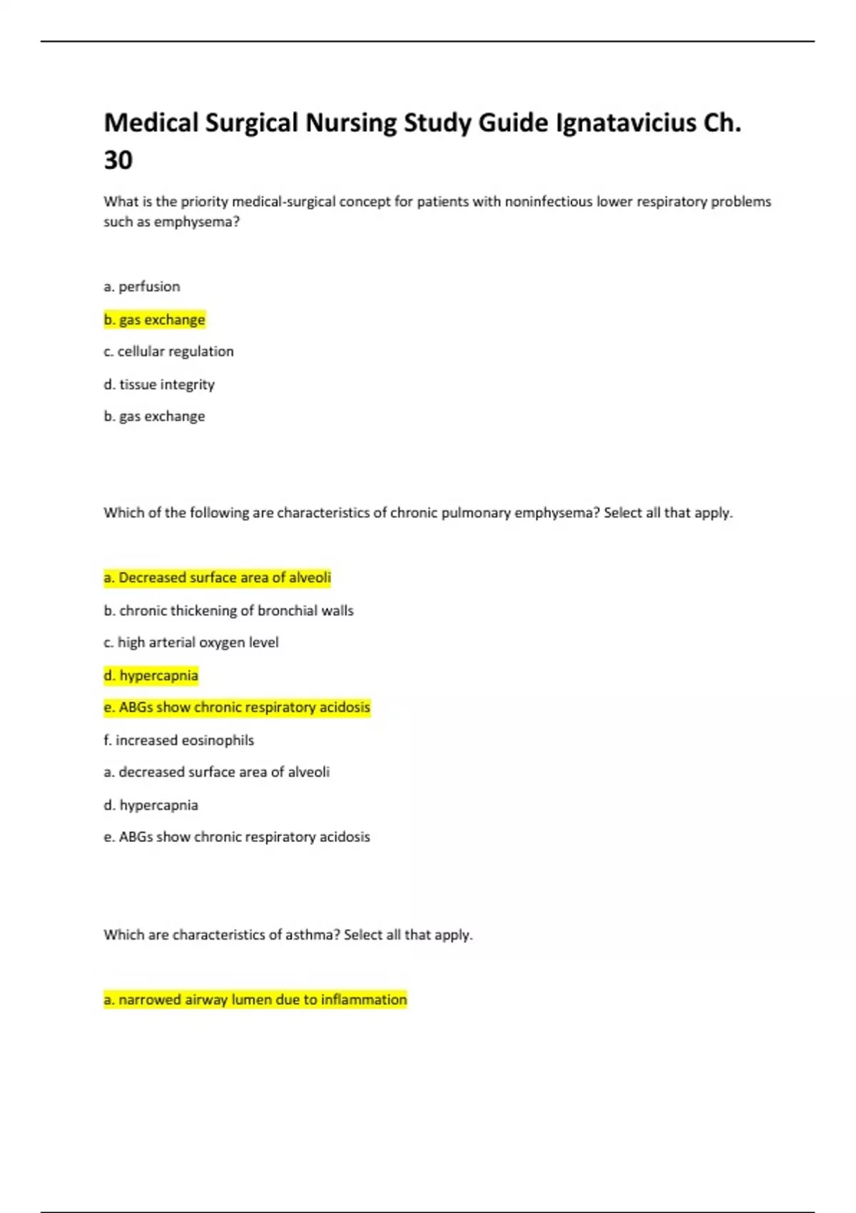 What is the priority medical-surgical concept for patients with noninfectious lower respiratory problems such as emphysema? a. perfusion b. gas exchange c. cellular regulation d. tissue integrity b. gas exchange Which of the following are characteristics of chronic pulmonary emphysema? Select all that apply. a. Decreased surface area of alveoli b. chronic thickening of bronchial walls c. high arterial oxygen level d. hypercapnia e. ABGs show chronic respiratory acidosis f. increased eosinophils a. decreased surface area of alveoli d. hypercapnia e. ABGs show chronic respiratory acidosis
