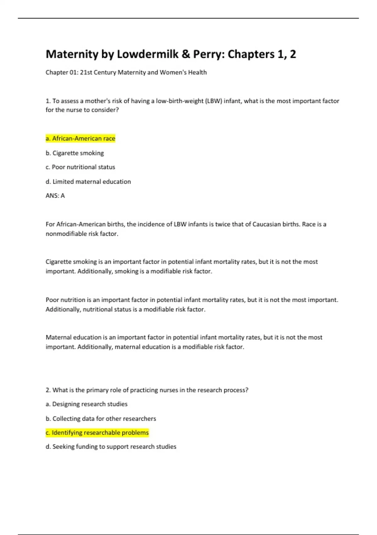Chapter 01: 21st Century Maternity and Women's Health 1. To assess a mother's risk of having a low-birth-weight (LBW) infant, what is the most important factor for the nurse to consider? a. African-American race b. Cigarette smoking c. Poor nutritional status d. Limited maternal education ANS: A For African-American births, the incidence of LBW infants is twice that of Caucasian births. Race is a nonmodifiable risk factor. Cigarette smoking is an important factor in potential infant mortality rates, but it is not the most important. Additionally, smoking is a modifiable risk factor. Poor nutrition is an important factor in potential infant mortality rates, but it is not the most important. Additionally, nutritional status is a modifiable risk factor. Maternal education is an important factor in potential infant mortality rates, but it is not the most important. Additionally, maternal education is a modifiable risk factor. 2. What is the primary role of practicing nurses in the research process? a. Designing research studies b. Collecting data for other researchers c. Identifying researchable problems d. Seeking funding to support research studies