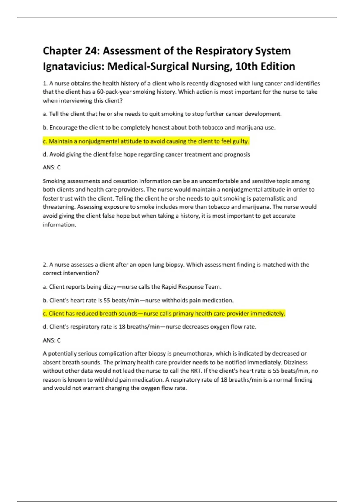 1. A nurse obtains the health history of a client who is recently diagnosed with lung cancer and identifies that the client has a 60-pack-year smoking history. Which action is most important for the nurse to take when interviewing this client? a. Tell the client that he or she needs to quit smoking to stop further cancer development. b. Encourage the client to be completely honest about both tobacco and marijuana use. c. Maintain a nonjudgmental attitude to avoid causing the client to feel guilty. d. Avoid giving the client false hope regarding cancer treatment and prognosis ANS: C Smoking assessments and cessation information can be an uncomfortable and sensitive topic among both clients and health care providers. The nurse would maintain a nonjudgmental attitude in order to foster trust with the client. Telling the client he or she needs to quit smoking is paternalistic and threatening. Assessing exposure to smoke includes more than tobacco and marijuana. The nurse would avoid giving the client false hope but when taking a history, it is most important to get accurate information. 2. A nurse assesses a client after an open lung biopsy. Which assessment finding is matched with the correct intervention? a. Client reports being dizzy—nurse calls the Rapid Response Team. b. Client's heart rate is 55 beats/min—nurse withholds pain medication. c. Client has reduced breath sounds—nurse calls primary health care provider immediately. d. Client's respiratory rate is 18 breaths/min—nurse decreases oxygen flow rate. ANS: C