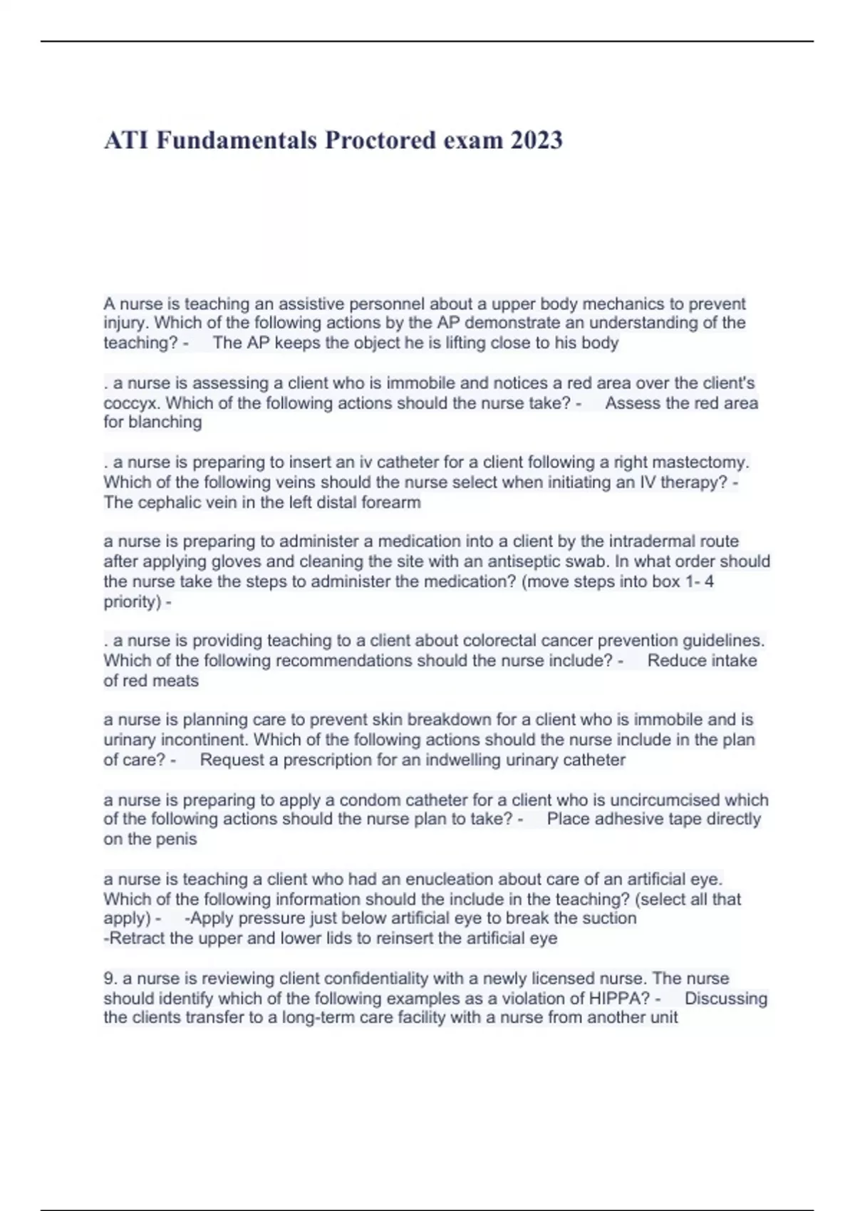 A nurse is teaching an assistive personnel about a upper body mechanics to prevent injury. Which of the following actions by the AP demonstrate an understanding of the teaching? - The AP keeps the object he is lifting close to his body . a nurse is assessing a client who is immobile and notices a red area over the client's coccyx. Which of the following actions should the nurse take? - Assess the red area for blanching . a nurse is preparing to insert an iv catheter for a client following a right mastectomy. Which of the following veins should the nurse select when initiating an IV therapy? - The cephalic vein in the left distal forearm