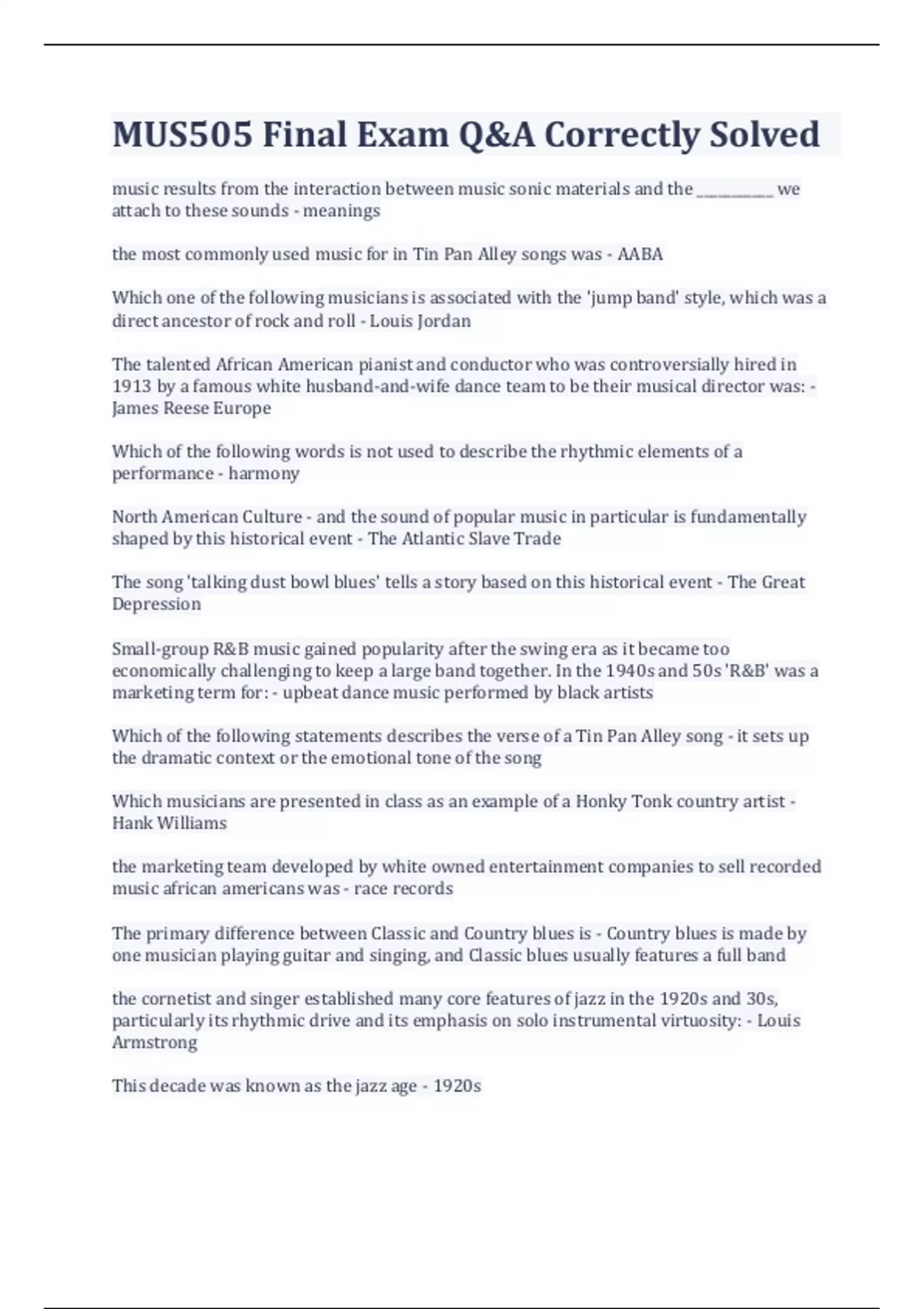 MUS505 Final Exam Q&A Correctly Solved music results from the interaction between music sonic materials and the ___________ we attach to these sounds - meanings the most commonly used music for in Tin Pan Alley songs was - AABA Which one of the following musicians is associated with the 'jump band' style, which was a direct ancestor of rock and roll - Louis Jordan The talented African American pianist and conductor who was controversially hired in 1913 by a famous white husband-and-wife dance team to be their musical director was: - James Reese Europe Which of the following words is not used to describe the rhythmic elements of a performance - harmony North American Culture - and the sound of popular music in particular is fundamentally shaped by this historical event - The Atlantic Slave Trade The song 'talking dust bowl blues' tells a story based on this historical event - The Great Depression Small-group R&B music gained popularity after the swing era as it became too economically challenging to keep a large band together. In the 1940s and 50s 'R&B' was a marketing term for: - upbeat dance music performed by black artists Which of the following statements describes the verse of a Tin Pan Alley song - it sets up the dramatic context or the emotional tone of the song Which musicians are presented in class as an example of a Honky Tonk country artist - Hank Williams the marketing team developed by white owned entertainment companies to sell recorded music african americans was - race records The primary difference between Classic and Country blues is - Country blues is made by one musician playing guitar and singing, and Classic blues usually features a full band the cornetist and singer established many core features of jazz in the 1920s and 30s, particularly its rhythmic drive and its emphasis on solo instrumental virtuosity: - Louis Armstrong This decade was known as the jazz age - 1920s vaudeville shows were distinguished from minstrel shows by - being a collection of songs, skits and comedy routines that did not follow a clear plot and story line the group made the first recordings of New Orleans-style jazz that established the style as an exciting new sound - King Oliver's Creole Jazz Band during the early 20th century jewish immigrants from central and eastern europe played an important role in the music business as - lyricists, composers, music publishers, performers The popular Vaudeville star who performed in blackface and was featured in The Jazz Singer, the first film to include sound, was: - Al Jolson the rhythmic framework for most African American influenced popular music includes an emphasis on beats 2 and 4 of a bar of music. this is called the - back beat The rhythmic element found in African American dance music that has been exciting white audiences for centuries is called: - syncopation a strophic song is - a tune/melody that is repeated several times, each time with different works sung to the same melody music is - used to enforce social boundaries, a commodity that can be bought and sold, often connected to spirituality, in a complicated relationship between commerce, politics & emotion Which popular bandleader created the first racially integrated jazz band when he formed a quartet that included the African American musicians Lionel Hampton on vibes and Teddy Wilson on piano? - Benny Goodman