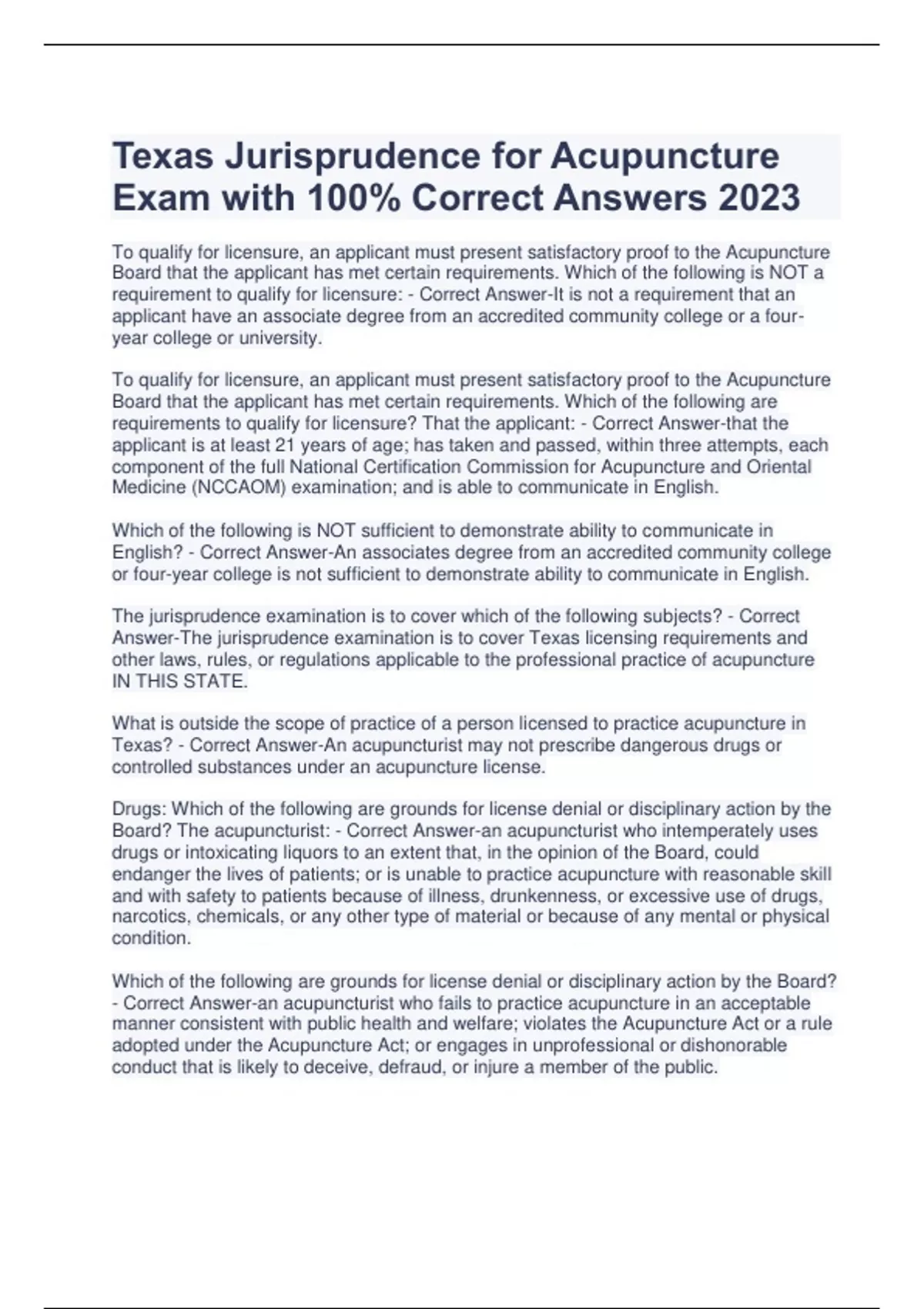 To qualify for licensure, an applicant must present satisfactory proof to the Acupuncture Board that the applicant has met certain requirements. Which of the following is NOT a requirement to qualify for licensure: - Correct Answer-It is not a requirement that an applicant have an associate degree from an accredited community college or a fouryear college or university. To qualify for licensure, an applicant must present satisfactory proof to the Acupuncture Board that the applicant has met certain requirements. Which of the following are requirements to qualify for licensure? That the applicant: - Correct Answer-that the applicant is at least 21 years of age; has taken and passed, within three attempts, each component of the full National Certification Commission for Acupuncture and Oriental Medicine (NCCAOM) examination; and is able to communicate in English. Which of the following is NOT sufficient to demonstrate ability to communicate in English? - Correct Answer-An associates degree from an accredited community college or four-year college is not sufficient to demonstrate ability to communicate in English. The jurisprudence examination is to cover which of the following subjects? - Correct Answer-The jurisprudence examination is to cover Texas licensing requirements and other laws, rules, or regulations applicable to the professional practice of acupuncture IN THIS STATE. What is outside the scope of practice of a person licensed to practice acupuncture in Texas? - Correct Answer-An acupuncturist may not prescribe dangerous drugs or controlled substances under an acupuncture license. Drugs: Which of the following are grounds for license denial or disciplinary action by the Board? The acupuncturist: - Correct Answer-an acupuncturist who intemperately uses drugs or intoxicating liquors to an extent that, in the opinion of the Board, could endanger the lives of patients; or is unable to practice acupuncture with reasonable skill and with safety to patients because of illness, drunkenness, or excessive use of drugs, narcotics, chemicals, or any other type of material or because of any mental or physical condition. Which of the following are grounds for license denial or disciplinary action by the Board? - Correct Answer-an acupuncturist who fails to practice acupuncture in an acceptable manner consistent with public health and welfare; violates the Acupuncture Act or a rule adopted under the Acupuncture Act; or engages in unprofessional or dishonorable conduct that is likely to deceive, defraud, or injure a member of the public.The Board has grounds for license denial or disciplinary action against an acupuncturist who has been convicted of a crime involving - Correct Answer-moral turpitude or a felony or is the subject of deferred adjudication or pretrial diversio
