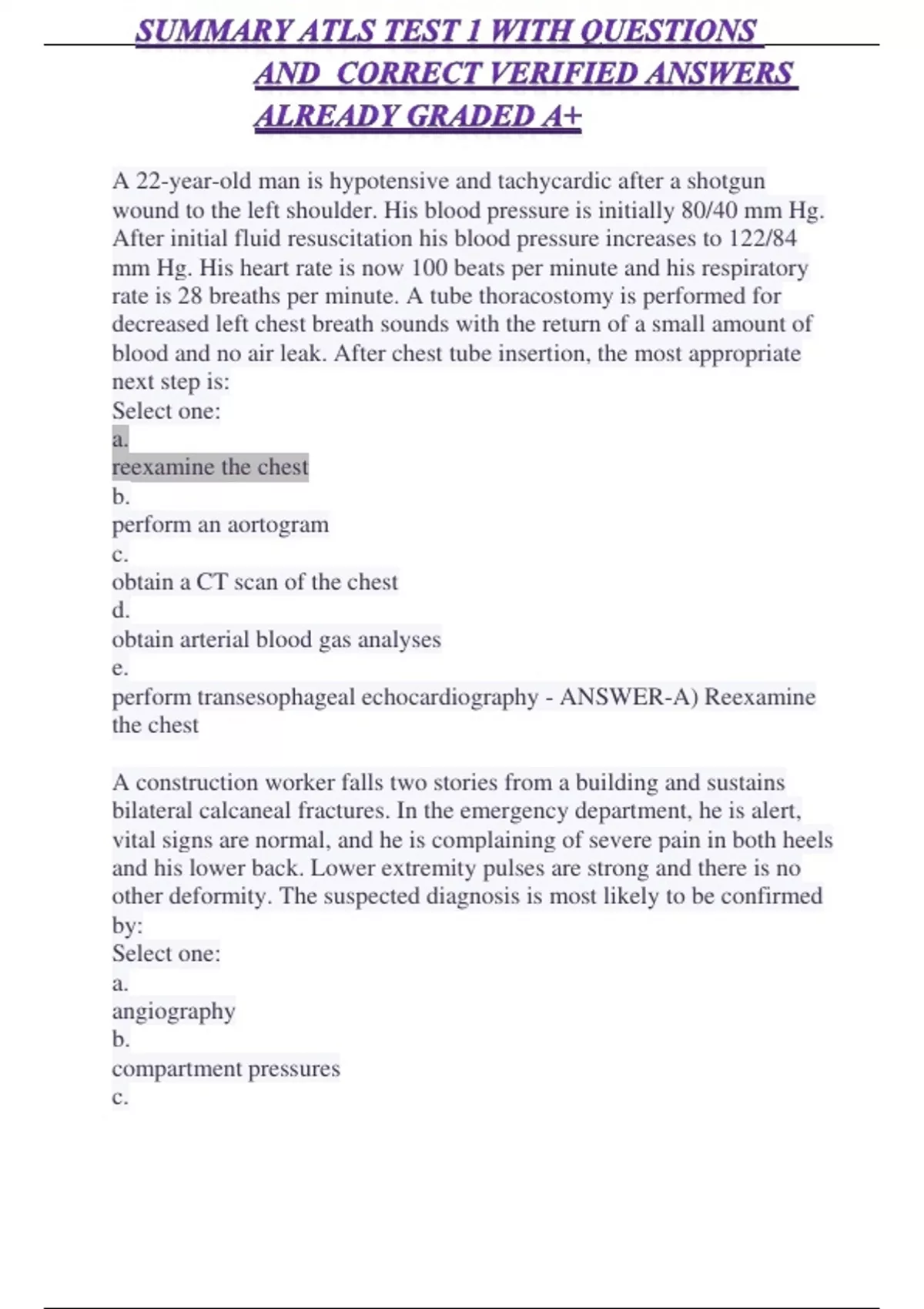 SUMMARY ATLS TEST 1 WITH QUESTIONS AND CORRECT VERIFIED ANSWERS ALREADY GRADED A+