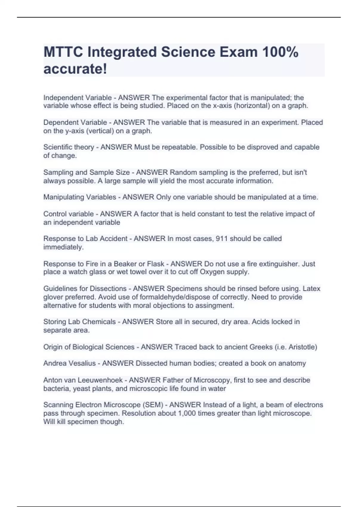 MTTC Integrated Science Exam Independent Variable - ANSWER The experimental factor that is manipulated; the variable whose effect is being studied. Placed on the x-axis (horizontal) on a graph. Dependent Variable - ANSWER The variable that is measured in an experiment. Placed on the y-axis (vertical) on a graph. Scientific theory - ANSWER Must be repeatable. Possible to be disproved and capable of change. Sampling and Sample Size - ANSWER Random sampling is the preferred, but isn't always possible. A large sample will yield the most accurate information. Manipulating Variables - ANSWER Only one variable should be manipulated at a time. Control variable - ANSWER A factor that is held constant to test the relative impact of an independent variable Response to Lab Accident - ANSWER In most cases, 911 should be called immediately. Response to Fire in a Beaker or Flask - ANSWER Do not use a fire extinguisher. Just place a watch glass or wet towel over it to cut off Oxygen supply. Guidelines for Dissections - ANSWER Specimens should be rinsed before using. Latex glover preferred. Avoid use of formaldehyde/dispose of correctly. Need to provide alternative for students with moral objections to assingment. Storing Lab Chemicals - ANSWER Store all in secured, dry area. Acids locked in separate area. Origin of Biological Sciences - ANSWER Traced back to ancient Greeks (i.e. Aristotle) Andrea Vesalius - ANSWER Dissected human bodies; created a book on anatomy Anton van Leeuwenhoek - ANSWER Father of Microscopy, first to see and describe bacteria, yeast plants, and microscopic life found in water Scanning Electron Microscope (SEM) - ANSWER Instead of a light, a beam of electrons pass through specimen. Resolution about 1,000 times greater than light microscope. Will kill specimen though. Robert Hooke - ANSWER Famous for Hook's law describing elasticity. But called a "virtuoso", able to contribute findings to any major field in science Carl Von Linnaeus - ANSWER Famous for binomial system of nomenclature. Each living organism has two names, a genus and species. Considered father of modern ecology and taxonomy Pasteur - ANSWER Discovered role of microorganisms in the cause of disease, pasteurization, and rabies vaccine. Koch's Postulates - ANSWER Specific diseases caused by specific pathogens Cell theory - ANSWER Cell is the common structural unit in plants and animals. Proposed by Mattias Scheleiden and Schwann. Watson and Crick - ANSWER Discovered the structure of DNA was a double helix (in the 1950s). Made it possible to understand how DNA replicated and synthesized proteins Commonalities Among all Sciences - ANSWER - Systems, order, and organization - Evidence, models, and explanation - Constancy, change, and measurement - Evolution and equilibrium - Form and function Empirical Evidence - ANSWER All evidence is empirical; all evidence must be observed by the five sense. Peer-reviewed Journals - ANSWER Most accepted source for information on scientific experiments and studies Air Pollution - ANSWER Chemicals in the air; include carbon monoxide, sulfur dioxide, and chlorofluorocarbons 100% accurate!