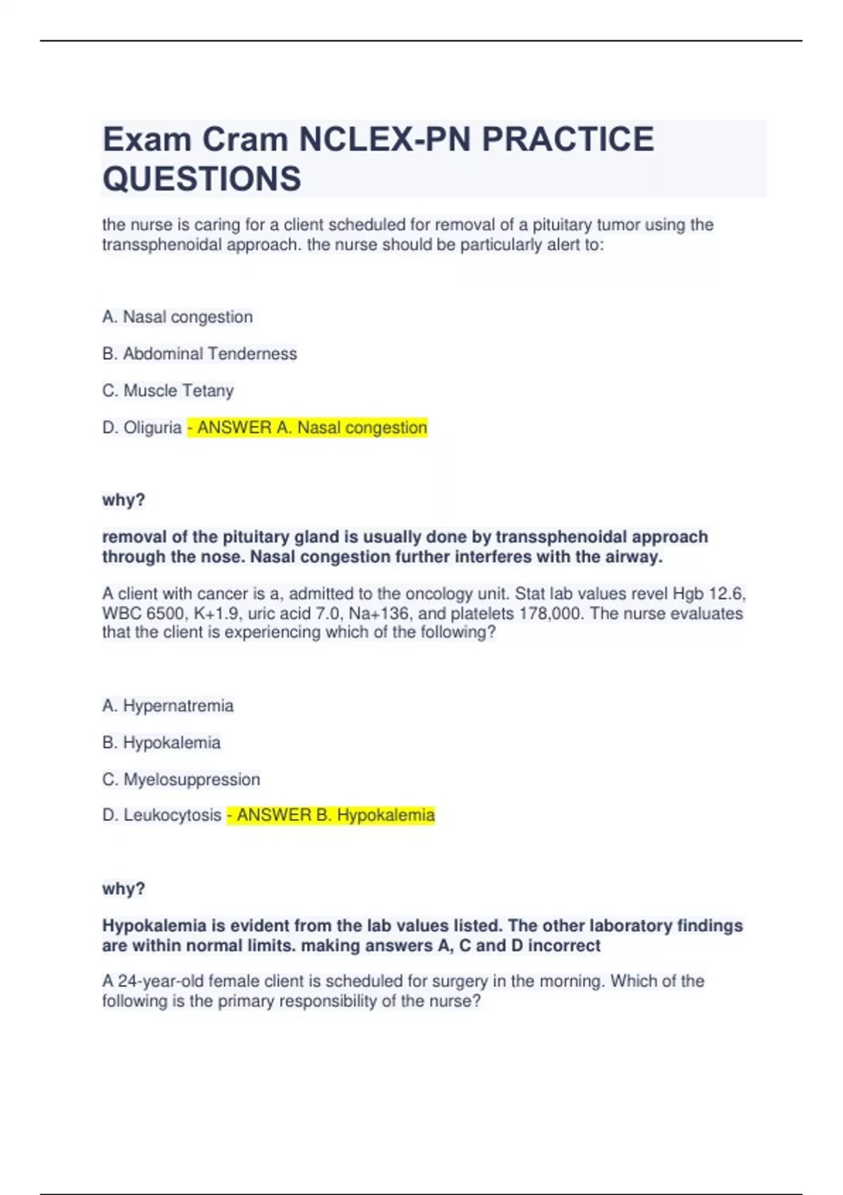 Exam Cram NCLEX-PN PRACTICE QUESTIONS the nurse is caring for a client scheduled for removal of a pituitary tumor using the transsphenoidal approach. the nurse should be particularly alert to: A. Nasal congestion B. Abdominal Tenderness C. Muscle Tetany D. Oliguria - ANSWER A. Nasal congestion why? removal of the pituitary gland is usually done by transsphenoidal approach through the nose. Nasal congestion further interferes with the airway. A client with cancer is a, admitted to the oncology unit. Stat lab values revel Hgb 12.6, WBC 6500, K+1.9, uric acid 7.0, Na+136, and platelets 178,000. The nurse evaluates that the client is experiencing which of the following? A. Hypernatremia B. Hypokalemia C. Myelosuppression D. Leukocytosis - ANSWER B. Hypokalemia why? Hypokalemia is evident from the lab values listed. The other laboratory findings are within normal limits. making answers A, C and D incorrect A 24-year-old female client is scheduled for surgery in the morning. Which of the following is the primary responsibility of the nurse? A. taking the vital signs B. obtaining the permit C. explaining the procedure D. Checking the lab work - ANSWER A. taking the vital signs why? the primary responsibility of the nurse is to take the vital signs before any surgery. answers B, C and D are the responsibility of the doctor. The nurse is working in the emergency room when a client arrives with severe burns of the left arm, hands, face, and neck. which action should receive priority? A. starting an IV? B. Applying oxygen C.Obtaining blood gas D. Medicating the client foe pain - ANSWER B. Applying oxygen why? the client with burns to the neck needs airway assessments and supplemental oxygen, so applying oxygen is priority. the next action should be to start an IV and medicate for pain. The nurse is visiting a home health client with osteoporosis. The client has a new prescription for alendronate (Fosamax). Which instructions should be given to the client A. rest in bed after taking the medication for at least 30 mins B. Avoid rapid movements after taking the medication C. Take medication with water only D. Allow at least 1 hour between taking the medicine and taking other medications - ANSWER C. Take medication with water only why? Fosamax should be taken with water only. The client should also remain upright for at least 30 mins after taking the medication. The nurse is making initial rounds on a client with a C5 fracture and crutch field thongs. Which equipment should be kept at the bedside? A. A pair of forceps B. A torque wrench C. A pair or wire cutters D. A screwdriver - ANSWER B. A torque wrench why? A torque wrench is kept at the bedside to tighten and loosen the screws of crutch field tongs. This wrench controls the amount of pressure that is placed on the screws. An infant weighs 7 pounds at birth. The expected weight by 1 year should be: A. 10 pounds B.12 pounds C. 18 pounds