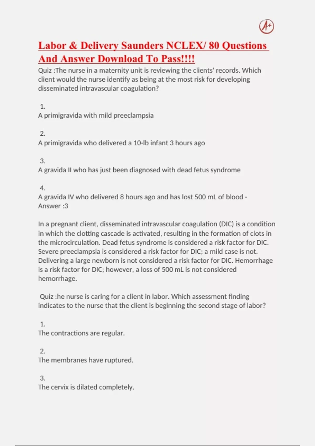 Labor & Delivery Saunders NCLEX/ 80 Questions And Answer Download To Pass!!!!
