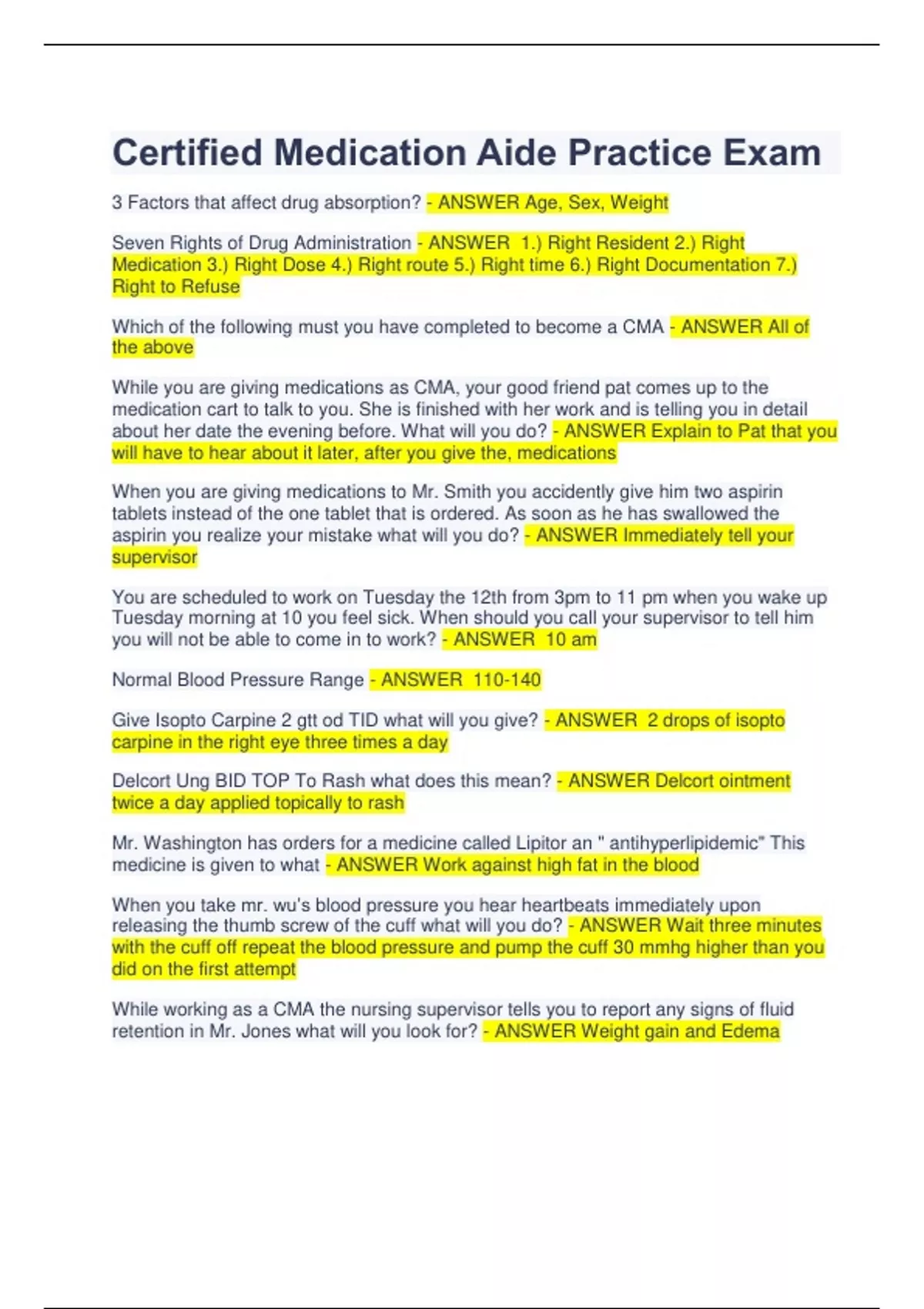 Certified Medication Aide Practice Exam 3 Factors that affect drug absorption? - ANSWER Age, Sex, Weight Seven Rights of Drug Administration - ANSWER 1.) Right Resident 2.) Right Medication 3.) Right Dose 4.) Right route 5.) Right time 6.) Right Documentation 7.) Right to Refuse Which of the following must you have completed to become a CMA - ANSWER All of the above While you are giving medications as CMA, your good friend pat comes up to the medication cart to talk to you. She is finished with her work and is telling you in detail about her date the evening before. What will you do? - ANSWER Explain to Pat that you will have to hear about it later, after you give the, medications When you are giving medications to Mr. Smith you accidently give him two aspirin tablets instead of the one tablet that is ordered. As soon as he has swallowed the aspirin you realize your mistake what will you do? - ANSWER Immediately tell your supervisor You are scheduled to work on Tuesday the 12th from 3pm to 11 pm when you wake up Tuesday morning at 10 you feel sick. When should you call your supervisor to tell him you will not be able to come in to work? - ANSWER 10 am Normal Blood Pressure Range - ANSWER 110-140 Give Isopto Carpine 2 gtt od TID what will you give? - ANSWER 2 drops of isopto carpine in the right eye three times a day Delcort Ung BID TOP To Rash what does this mean? - ANSWER Delcort ointment twice a day applied topically to rash Mr. Washington has orders for a medicine called Lipitor an " antihyperlipidemic" This medicine is given to what - ANSWER Work against high fat in the blood When you take mr. wu’s blood pressure you hear heartbeats immediately upon releasing the thumb screw of the cuff what will you do? - ANSWER Wait three minutes with the cuff off repeat the blood pressure and pump the cuff 30 mmhg higher than you did on the first attempt While working as a CMA the nursing supervisor tells you to report any signs of fluid retention in Mr. Jones what will you look for? - ANSWER Weight gain and Edema Mrs. White has a new heart medication she complains of feeling dizzy, especially when she stands up suddenly. Which of the following cardiovascular side effects might she be experiencing? - ANSWER Decreased Blood Pressure Mr. Black complained about seeing rings light " halos " around lighted objects what medication might be rising to toxic levels in Mr. Blacks Blood? - ANSWER Digoxin (Heart Medicine ) As you give medications you notice that Ms. Chong has antihyperlipidemic ordered. You know that Ms. Chong must have high? - ANSWER Cholesterol and Triglycerides Mr. Black is taking an anticoagulant You know that he should be watched for signs of - ANSWER Bleeding Mrs. White is taking a thiazide diuretic a major side effect of this drug could be? - ANSWER low potassium Mr. Jones is taking a medication that decreases the amount of acid made by his stomach this medicine is given to treat - ANSWER ulcer Antineoplastic Medication is a for what - ANSWER Cancer Mrs. White asks you how putting a nitroglycerin patch on her arm will help her chest pain what will you tell her? - ANSWER The medicine in the patch will go through the skin and dial ate the blood vessels around her heart Before you give Mr. Black his anti-inflammatory medication what should you do? - ANSWER Check to see if he has eaten recently or else give the medicine with food Antitussives - ANSWER Controls Coughs Expectorant - ANSWER Helps to cough up phlegm Before you give Mr. Jones his Digoxin (Lanoxin) what will you check? - ANSWER His Pulse Under what circumstances will you not give the digoxin to Mr. Jones - ANSWER If his pulse is below 60 Enteric Coated Aspirin - ANSWER To dissolve in the intestines to prevent stomach irritation Sediment - ANSWER Shake the bottle then pour the medicine For Ophthalmic use? You will apply this medication where - ANSWER Ophthalmic means " EYE" The transdermal Nitroglycerin patch Mrs. White is wearing delivers nitroglycerin to her by? - ANSWER Slow absorption through the skin into the blood stream A long-term facility is - ANSWER a place that provides care for people who don't need to be in a hospital but who are not able to return home An observation that is factual or measurable in some way is a (n) - ANSWER objective observation A (n) _______ is an unfavorable or harmful unintended action of a medication - ANSWER adverse reaction A drug interaction can occur when - ANSWER Another substance or medication is present in the body Information included in the medication order - ANSWER The dosage and form of the medication The uap takes the pulse on an adult male and counts 72 beats per minute the uap knows that this rate is - ANSWER about average for an adult When counting the respirations remember that the average rate of respirations is _____ per minute - ANSWER 12-16 Normal blood pressure may be affected by many factors including - ANSWER Emotion and weight When measuring a blood pressure - ANSWER Place the cuff 4 inches above the elbow When measuring blood pressure place the bell of the stethoscope over the - ANSWER Brachial Artery The cardio vascular system is driven by the - ANSWER Heart The cardio vascular system works to - ANSWER Bring oxygen and nourishment to the cells and remove waste products A common disorder of the cardiovascular system would be - ANSWER Congestive heart failure The endocrine system is made up of - ANSWER Glands The glands of the endocrine system release ______ that control the body's activities and growth - ANSWER Hormones A common disorder of the endocrine system would be - ANSWER Diabetes Miletus The Gastrointestinal system works to - ANSWER Break down transport and absorb nutrients from food as well as remove waste Two of the structures in the gastrointestinal system are the - ANSWER Mouth and stomach