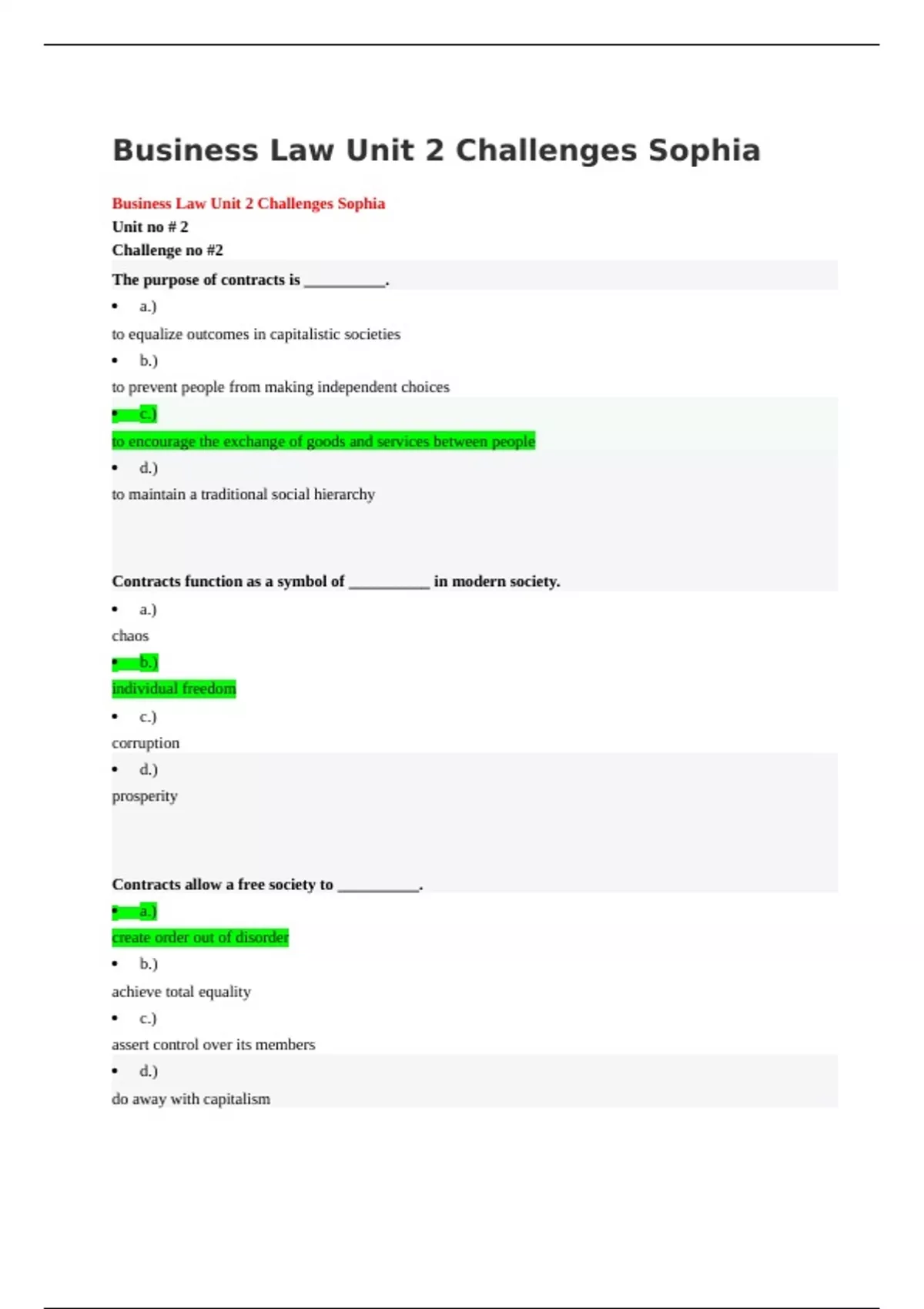 Business Law Unit 2 Challenges Sophia Business Law Unit 2 Challenges Sophia Unit no # 2 Challenge no #2 The purpose of contracts is __________. · a.) to equalize outcomes in capitalistic societies · b.) to prevent people from making independent choices · c.) to encourage the exchange of goods and services between people · d.) to maintain a traditional social hierarchy Contracts function as a symbol of __________ in modern society. · a.) chaos · b.) individual freedom · c.) corruption · d.) prosperity Contracts allow a free society to __________. · a.) create order out of disorder · b.) achieve total equality · c.) assert control over its members · d.) do away with capi