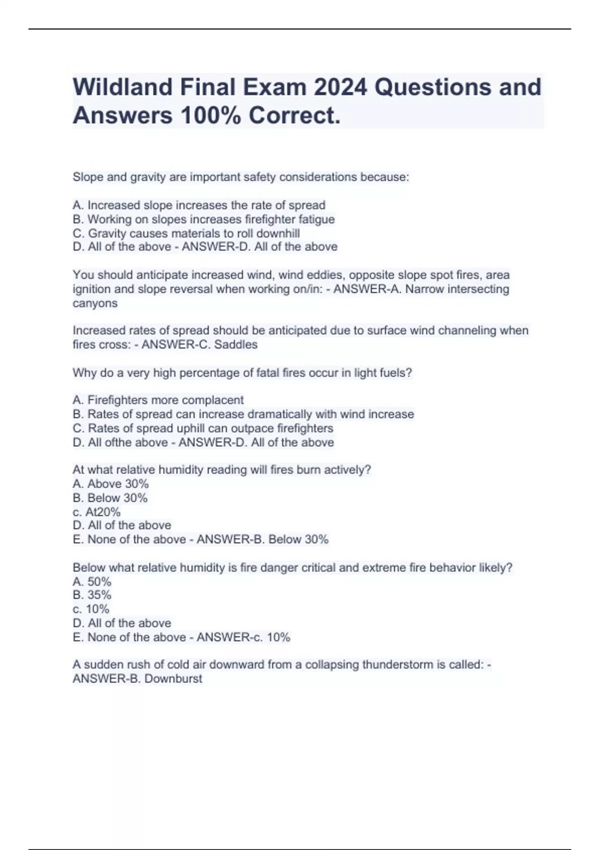 Slope and gravity are important safety considerations because: A. Increased slope increases the rate of spread B. Working on slopes increases firefighter fatigue C. Gravity causes materials to roll downhill D. All of the above - ANSWER-D. All of the above You should anticipate increased wind, wind eddies, opposite slope spot fires, area ignition and slope reversal when working on/in: - ANSWER-A. Narrow intersecting canyons Increased rates of spread should be anticipated due to surface wind channeling when fires cross: - ANSWER-C. Saddles Why do a very high percentage of fatal fires occur in light fuels? A. Firefighters more complacent B. Rates of spread can increase dramatically with wind increase C. Rates of spread uphill can outpace firefighters D. All ofthe above - ANSWER-D. All of the above At what relative humidity reading will fires burn actively? A. Above 30% B. Below 30% c. At20% D. All of the above E. None of the above - ANSWER-B. Below 30% Below what relative humidity is fire danger critical and extreme fire behavior likely? A. 50% B. 35% c. 10% D. All of the above E. None of the above - ANSWER-c. 10% A sudden rush of cold air downward from a collapsing thunderstorm is called: - ANSWER-B. Downburst The occurrence of multiple spot fires in an area so small they influence each other and result in a blow-up is called: A. Area ignition B. Fire whirl C. Vortex turbulence D. All of the above E. None of the above - ANSWER-A. Area ignition A sudden increase in intensiy, long range spotting, sustained crowing, and or broken inversion layers are indicators of? - ANSWER-B. Erratic fire behavior Adequate rest for firefighters is important because: A. Tired people make mental errors B. Tiredpeople make physical mistakes C. Tired people have poor judgment D. All of the above - ANSWER-D. All of the above Which of the following are symptoms of heat stress? - ANSWER-A. Muscle cramps, weakness, headaches, nausea Which of the following are symptoms of Carbon Monoxide poisoning? - ANSWER-C. Headache, fatigue, and drowsiness Besides we
