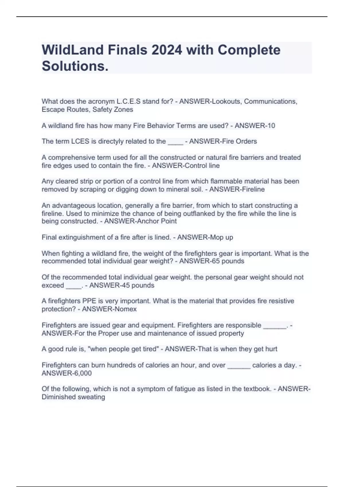 What does the acronym L.C.E.S stand for? - ANSWER-Lookouts, Communications, Escape Routes, Safety Zones A wildland fire has how many Fire Behavior Terms are used? - ANSWER-10 The term LCES is directyly related to the ____ - ANSWER-Fire Orders A comprehensive term used for all the constructed or natural fire barriers and treated fire edges used to contain the fire. - ANSWER-Control line Any cleared strip or portion of a control line from which flammable material has been removed by scraping or digging down to mineral soil. - ANSWER-Fireline An advantageous location, generally a fire barrier, from which to start constructing a fireline. Used to minimize the chance of being outflanked by the fire while the line is being constructed. - ANSWER-Anchor Point Final extinguishment of a fire after is lined. - ANSWER-Mop up When fighting a wildland fire, the weight of the firefighters gear is important. What is the recommended total individual gear weight? - ANSWER-65 pounds Of the recommended total individual gear weight. the personal gear weight should not exceed ____. - ANSWER-45 pounds A firefighters PPE is very important. What is the material that provides fire resistive protection? - ANSWER-Nomex Firefighters are issued gear and equipment. Firefighters are responsible ______. - ANSWER-For the Proper use and maintenance of issued property A good rule is, "when people get tired" - ANSWER-That is when they get hurt Firefighters can burn hundreds of calories an hour, and over ______ calories a day. - ANSWER-6,000 Of the following, which is not a symptom of fatigue as listed in the textbook. - ANSWER-Diminished sweating What is the incident command system? - ANSWER-Command The incident command system is organized into the ____ functional areas called - ANSWER-5