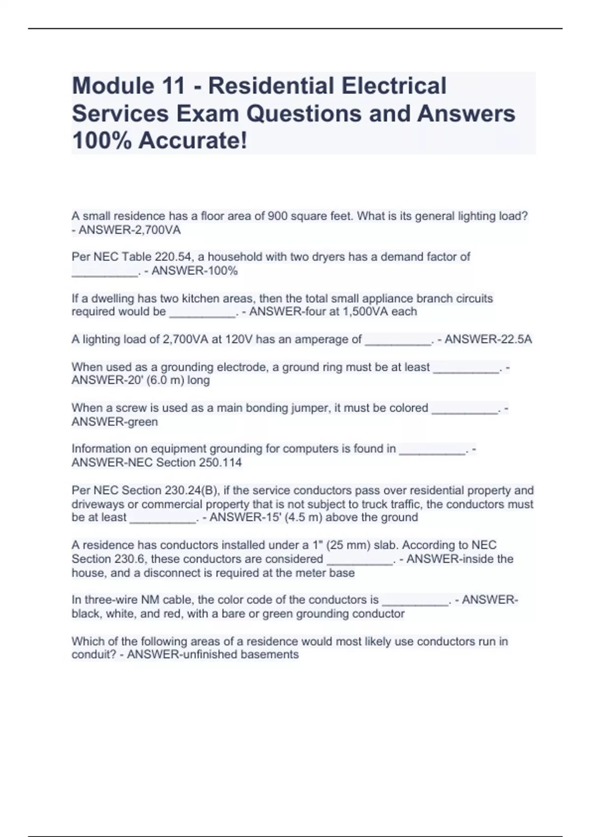 A small residence has a floor area of 900 square feet. What is its general lighting load? - ANSWER-2,700VA Per NEC Table 220.54, a household with two dryers has a demand factor of __________. - ANSWER-100% If a dwelling has two kitchen areas, then the total small appliance branch circuits required would be __________. - ANSWER-four at 1,500VA each A lighting load of 2,700VA at 120V has an amperage of __________. - ANSWER-22.5A When used as a grounding electrode, a ground ring must be at least __________. - ANSWER-20' (6.0 m) long When a screw is used as a main bonding jumper, it must be colored __________. - ANSWER-green Information on equipment grounding for computers is found in __________. - ANSWER-NEC Section 250.114 Per NEC Section 230.24(B), if the service conductors pass over residential property and driveways or commercial property that is not subject to truck traffic, the conductors must be at least __________. - ANSWER-15' (4.5 m) above the ground A residence has conductors installed under a 1" (25 mm) slab. According to NEC Section 230.6, these conductors are considered __________. - ANSWER-inside the house, and a disconnect is required at the meter base In three-wire NM cable, the color code of the conductors is __________. - ANSWER-black, white, and red, with a bare or green grounding conductor Which of the following areas of a residence would most likely use conductors run in conduit? - ANSWER-unfinished basements A branch circuit that supplies a storage-type water heater with a capacity of 120 gallons (450 L) or less and a nameplate rating of 20A must be rated at a minimum of __________. - ANSWER-25A A branch circuit for lighting has a capacity of 1,800VA. It should be loaded to no more than __________. - ANSWER-1,440VA A metallic outlet box for two No. 12 AWG conductors with a ground wire, cable clamp, a switch, a