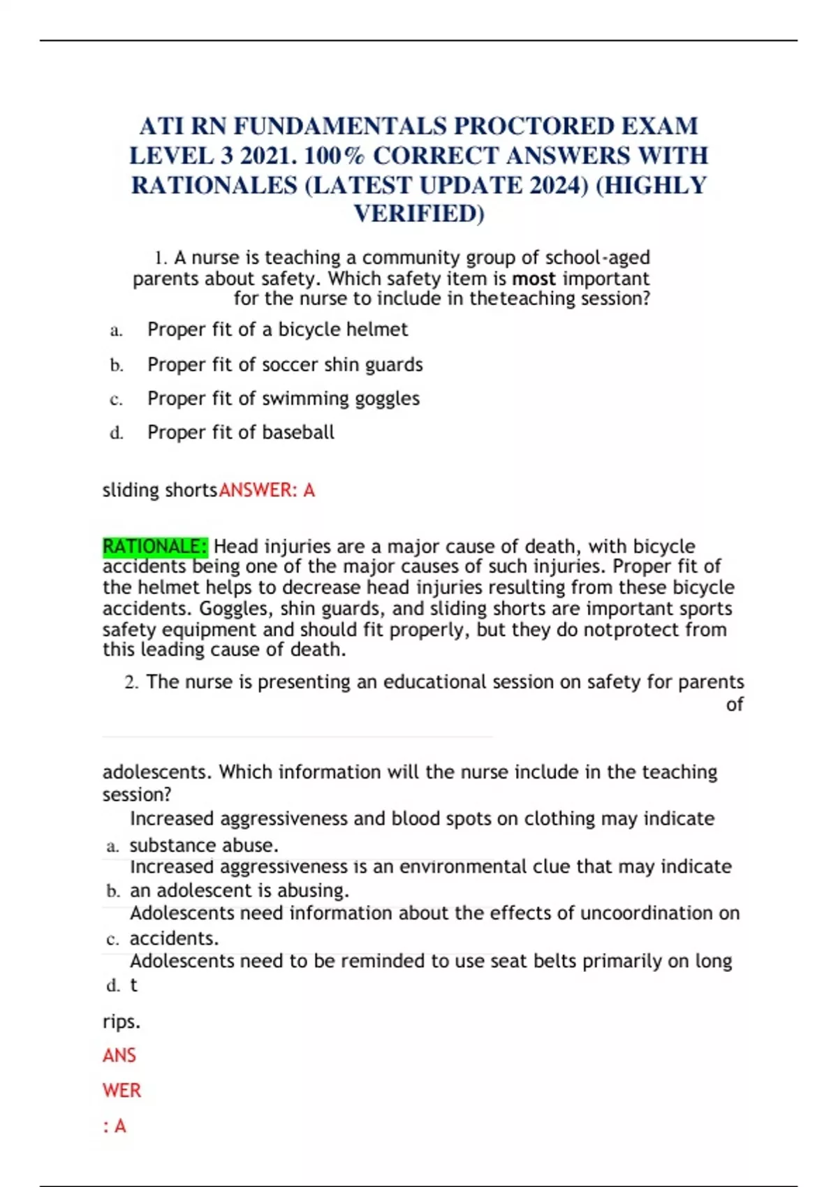ATI RN FUNDAMENTALS PROCTORED EXAM LEVEL 3 2021. 100% CORRECT ANSWERS WITH RATIONALES (LATEST UPDATE 2024) (HIGHLY VERIFIED) 1. A nurse is teaching a community group of school-aged parents about safety. Which safety item is most important for the nurse to include in the teaching session? a. Proper fit of a bicycle helmet b. Proper fit of soccer shin guards c. Proper fit of swimming goggles d. Proper fit of baseball sliding shorts ANSWER: A RATIONALE: Head injuries are a major cause of death, with bicycle accidents being one of the major causes of such injuries. Proper fit of the helmet helps to decrease head injuries resulting from these bicycle accidents. Goggles, shin guards, and sliding shorts are important sports safety equipment and should fit properly, but they do not protect from this leading cause of death. 2. The nurse is presenting an educational session on safety for parents of adolescents. Which information will the nurse include in the teaching session? Increased aggressiveness and blood spots on clothing may indicate a. substance abuse. Increased aggressiveness is an environmental clue that may indicate b. an adolescent is abusing.