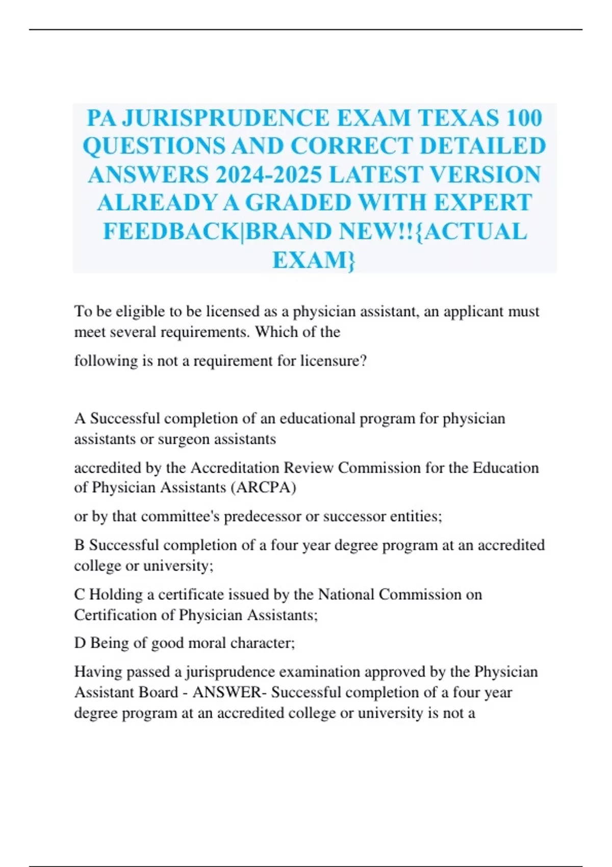 PA JURISPRUDENCE EXAM TEXAS 100 QUESTIONS AND CORRECT DETAILED ANSWERS LATEST VERSION ALREADY A GRADED WITH EXPERT FEEDBACK|BRAND NEW!!{ACTUAL EXAM}
