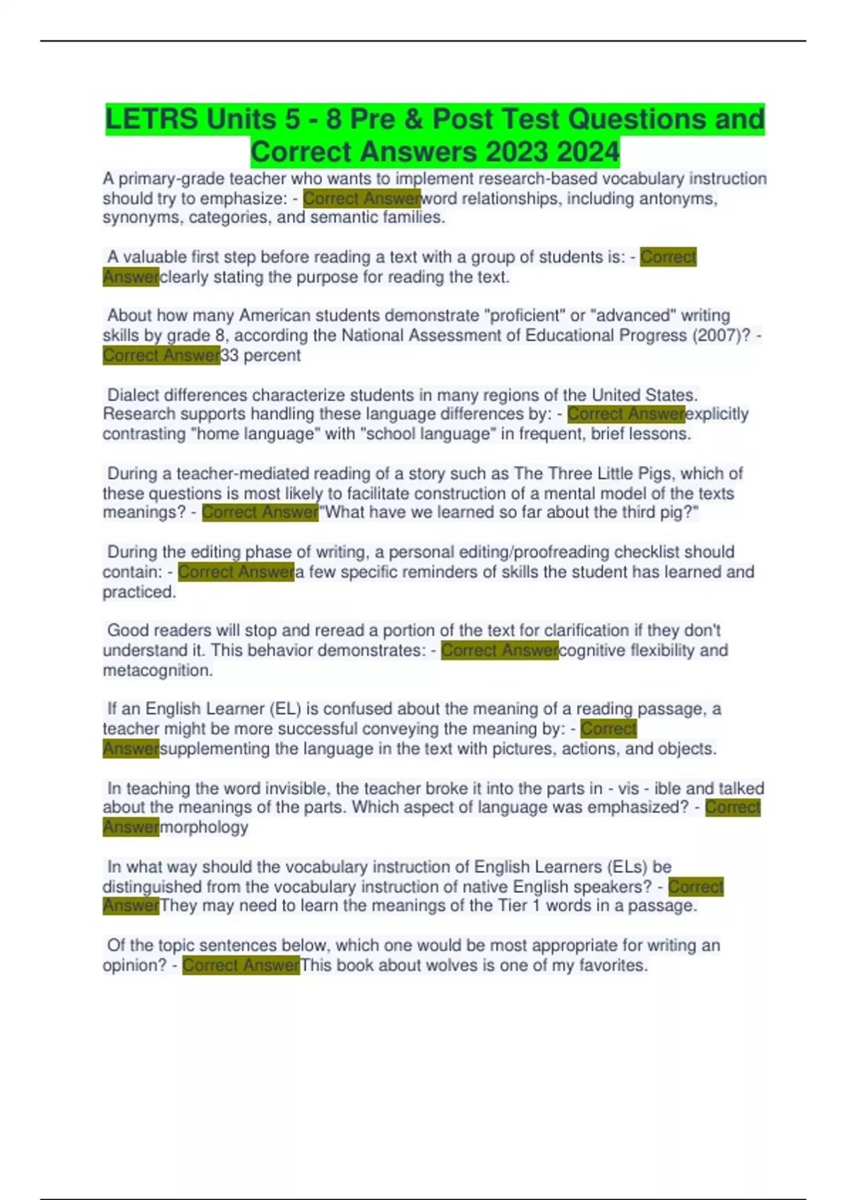 LETRS Units 5 - 8 Pre & Post Test Questions and Correct Answers
