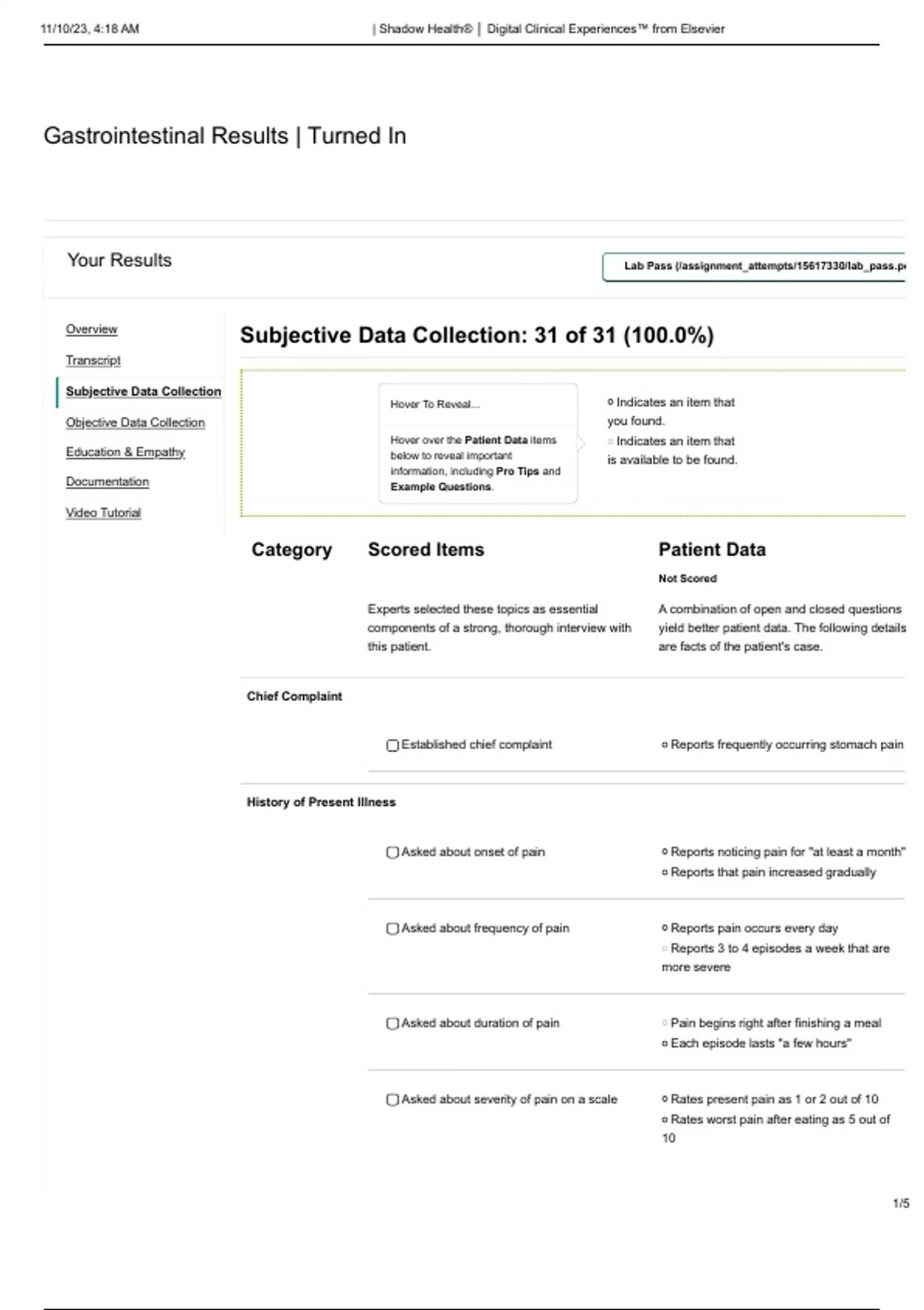 Your Results Lab Pass (/assignment_attempts//lab_ Overview Transcript Subjective Data Collection Objective Data Collection Education & Empathy Documentation Video Tutorial Indicates an item that you found. Indicates an item that is available to be found. Category Scored Items Experts selected these topics as essential components of a strong, thorough interview with this patient. Patient Data Not Scored A combination of open and closed questions yield better patient data. The following details are facts of the patient's case. Established chief complaint Reports frequently occurring stomach pain Asked about onset of pain Reports noticing pain for "at least a month" Reports that pain increased gradually Asked about frequency of pain Reports pain occurs every day Reports 3 to 4 episodes a week that are more severe Asked about duration of pain Pain begins right after finishing a meal Each episode lasts "a few hours" Asked about severity of pain on a scale Rates present pain as 1 or 2 out of 10 Rates worst pain after eating as 5 out of 10 Hover To Reveal... Hover over the Patient Data items below to reveal important information, including Pro Tips and Example